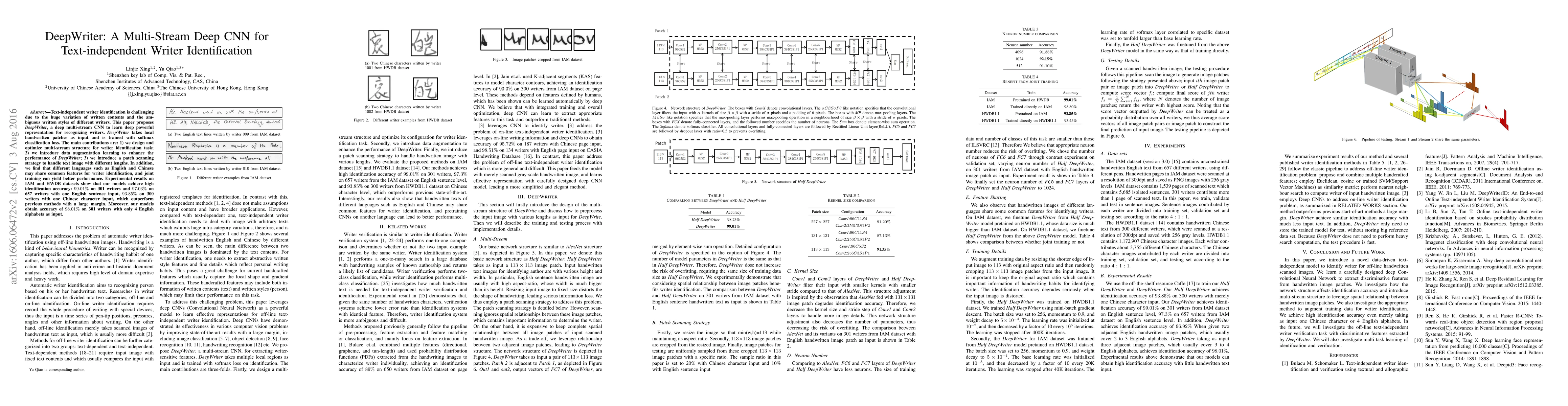 DeepWriter employs a multi-stream deep CNN architecture to achieve high accuracy in text-independent writer identification, leveraging local handwritten patches and data augmentation. Experimental results demonstrate superior performance on multiple datasets, outperforming previous methods significantly.