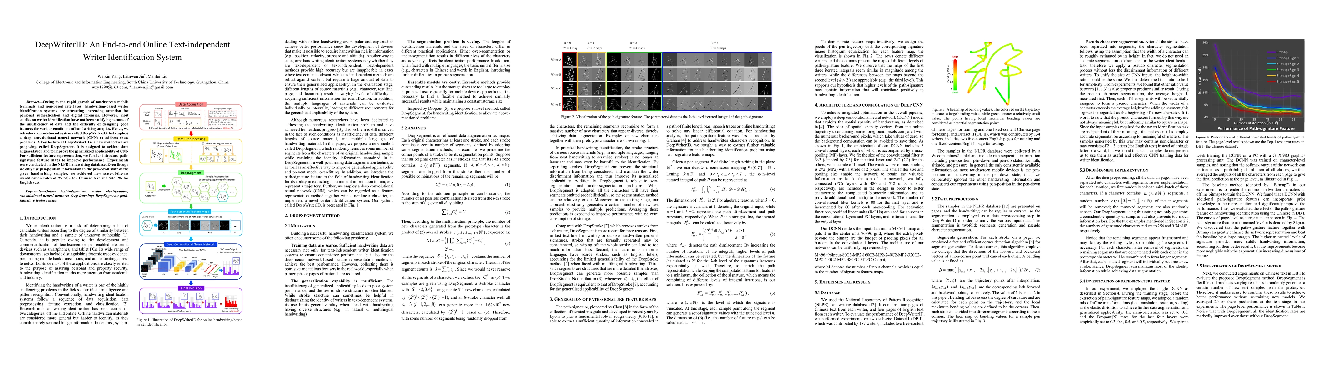 The proposed approach combines DropSegment, path-signature feature, and deep CNN to address online text-independent writer identification.