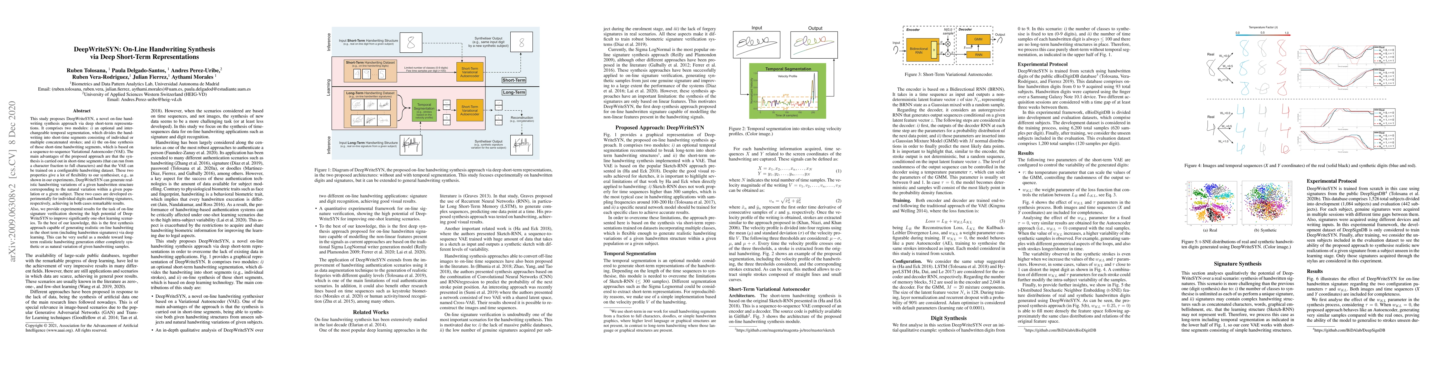 This study proposes DeepWriteSYN, a novel on-line handwriting synthesis approach via deep short-term representations. It comprises two modules: i) an optional and interchangeable temporal segmentation, which divides the handwriting into short-time segments consisting of individual or multiple concatenated strokes; and ii) the on-line synthesis of those short-time handwriting segments, which is based on a sequence-to-sequence Variational Autoencoder (VAE). The main advantages of the proposed approach are that the synthesis is carried out in short-time segments (that can run from a character fraction to full characters) and that the VAE can be trained on a configurable handwriting dataset. These two properties give a lot of flexibility to our synthesiser, e.g., as shown in our experiments, DeepWriteSYN can generate realistic handwriting variations of a given handwritten structure corresponding to the natural variation within a given population or a given subject. These two cases are developed experimentally for individual digits and handwriting signatures, respectively, achieving in both cases remarkable results. Also, we provide experimental results for the task of on-line signature verification showing the high potential of DeepWriteSYN to improve significantly one-shot learning scenarios. To the best of our knowledge, this is the first synthesis approach capable of generating realistic on-line handwriting in the short term (including handwritten signatures) via deep learning. This can be very useful as a module toward long-term realistic handwriting generation either completely synthetic or as natural variation of given handwriting samples.