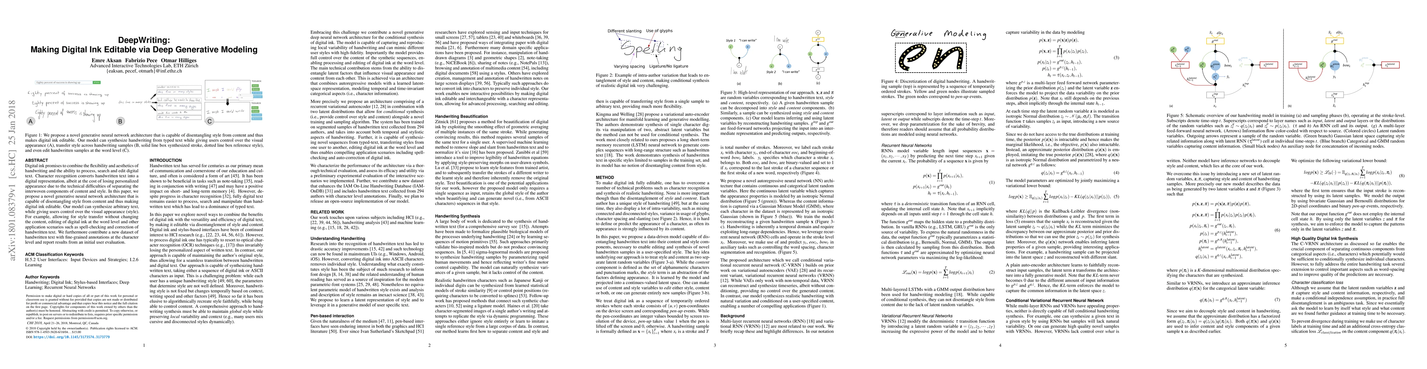 Digital ink promises to combine the flexibility and aesthetics of handwriting and the ability to process, search and edit digital text. Character recognition converts handwritten text into a digital representation, albeit at the cost of losing personalized appearance due to the technical difficulties of separating the interwoven components of content and style. In this paper, we propose a novel generative neural network architecture that is capable of disentangling style from content and thus making digital ink editable. Our model can synthesize arbitrary text, while giving users control over the visual appearance (style). For example, allowing for style transfer without changing the content, editing of digital ink at the word level and other application scenarios such as spell-checking and correction of handwritten text. We furthermore contribute a new dataset of handwritten text with fine-grained annotations at the character level and report results from an initial user evaluation.