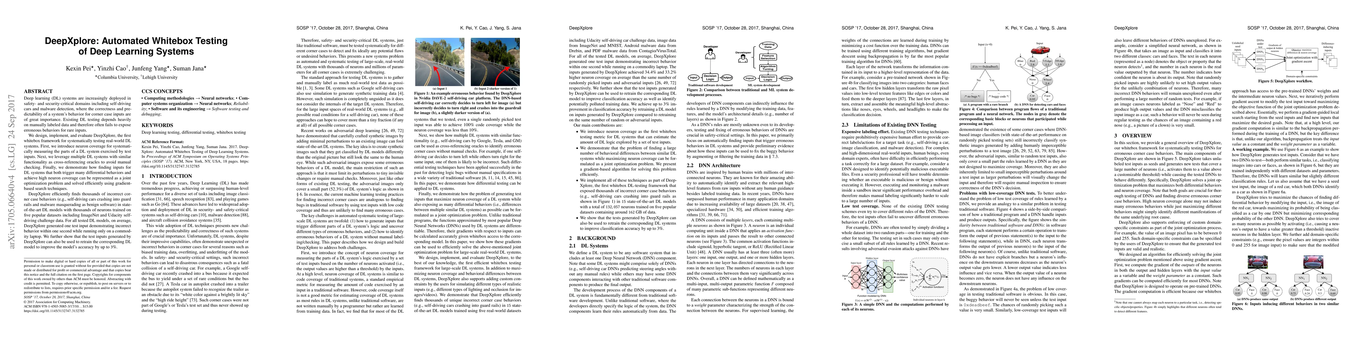 DeepXplore is a whitebox testing framework for deep learning systems that uses neuron coverage to measure exercised parts of a DL system, cross-referencing DL systems as oracles, and gradient-based search for optimization. It finds incorrect behaviors efficiently on commodity hardware.