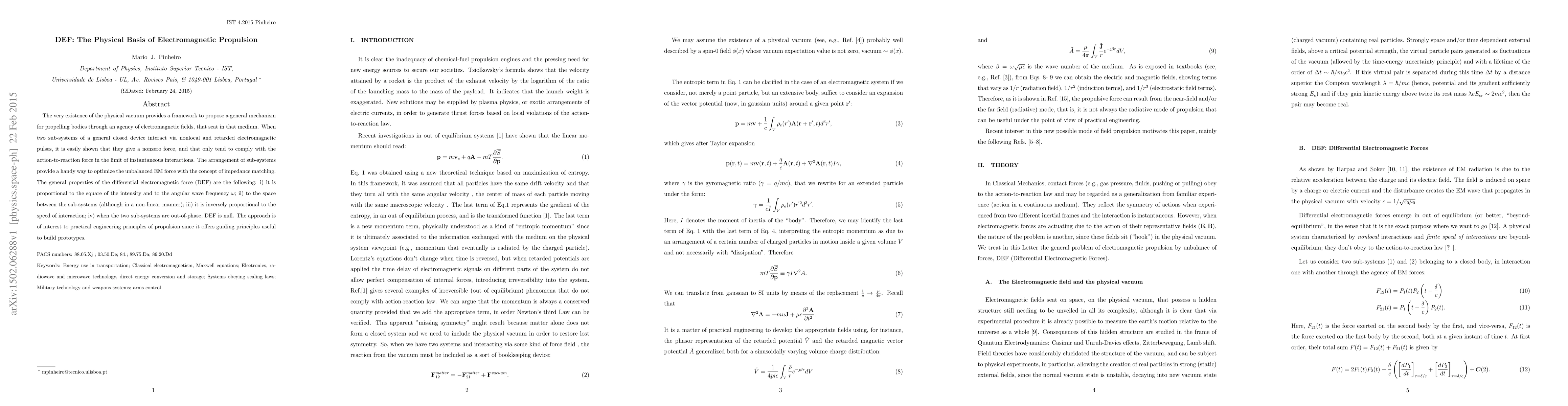 The very existence of the physical vacuum provides a framework to propose a general mechanism for propelling bodies through an agency of electromagnetic fields, that seat in that medium. When two sub-systems of a general closed device interact via nonlocal and retarded electromagnetic pulses, it is easily shown that they give a nonzero force, and that only tend to comply with the action-to-reaction force in the limit of instantaneous interactions. The arrangement of sub-systems provide a handy way to optimize the unbalanced EM force with the concept of impedance matching. The general properties of the differential electromagnetic force (DEF) are the following: i) it is proportional to the square of the intensity and to the angular wave frequency $\omega$; ii) to the space between the sub-systems (although in a non-linear manner); iii) it is inversely proportional to the speed of interaction; iv) when the two sub-systems are out-of-phase, DEF is null. The approach is of interest to practical engineering principles of propulsion since it offers guiding principles useful to build prototypes.