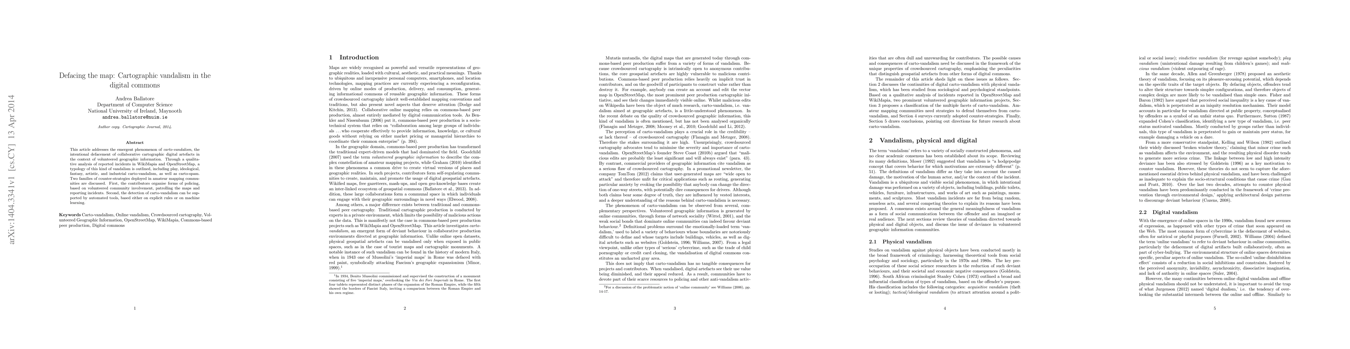 This paper explores carto-vandalism—the intentional defacement of collaborative digital maps—in platforms like WikiMapia and OpenStreetMap, categorizing it into play, ideological, fantasy, artistic, industrial, and carto-spam types. It discusses community policing and automated detection tools as counter-strategies.