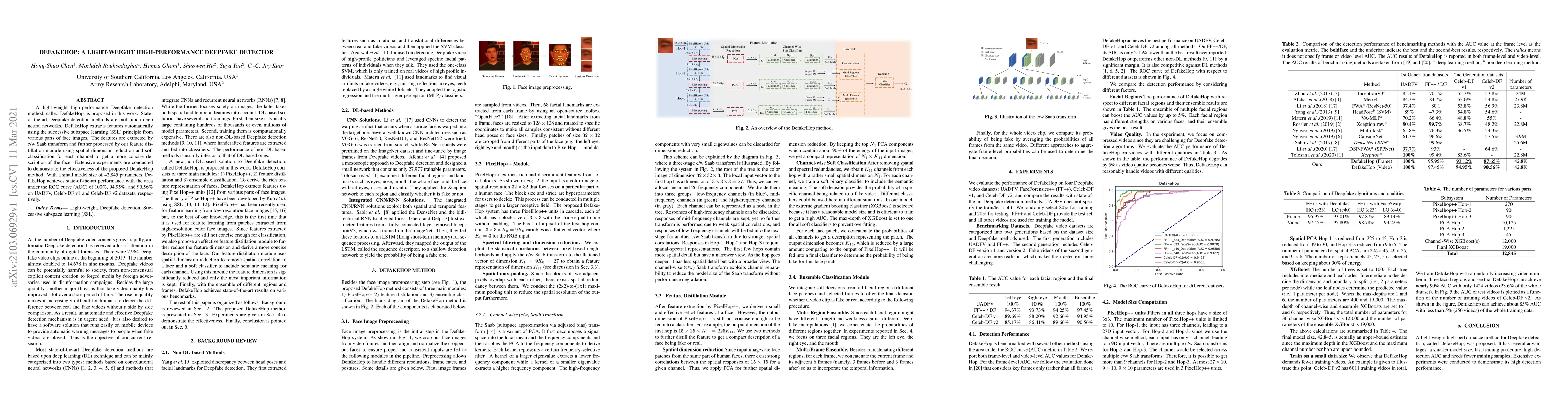 DefakeHop is a light-weight deepfake detection method utilizing successive subspace learning and feature distillation for high performance. It achieves state-of-the-art results with an AUC of 100%, 94.95%, and 90.56% on three datasets while maintaining a small model size of 42,845 parameters.