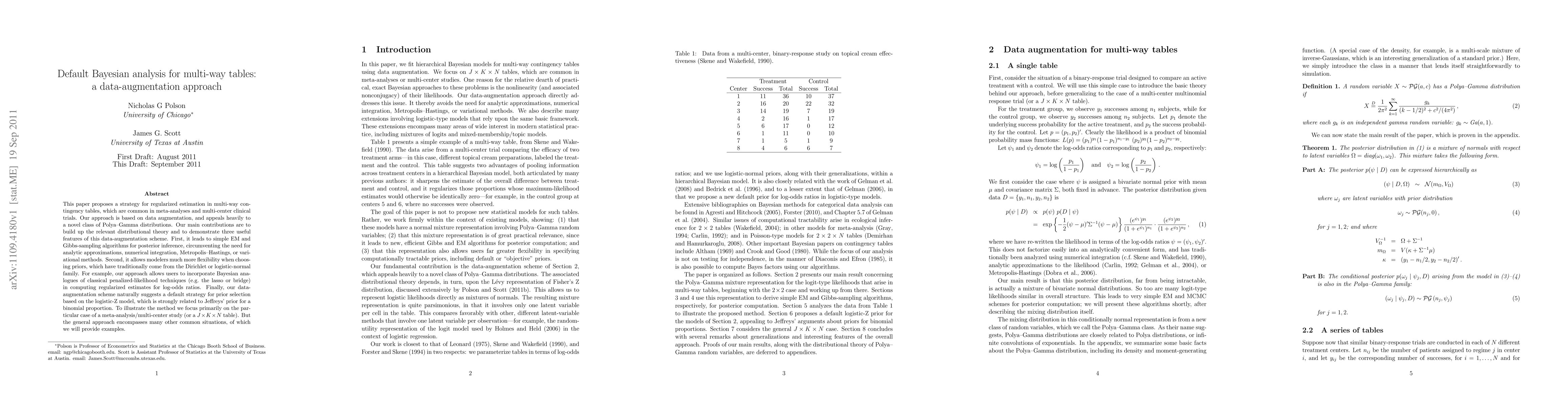 This paper proposes a strategy for regularized estimation in multi-way contingency tables, which are common in meta-analyses and multi-center clinical trials. Our approach is based on data augmentation, and appeals heavily to a novel class of Polya-Gamma distributions. Our main contributions are to build up the relevant distributional theory and to demonstrate three useful features of this data-augmentation scheme. First, it leads to simple EM and Gibbs-sampling algorithms for posterior inference, circumventing the need for analytic approximations, numerical integration, Metropolis--Hastings, or variational methods. Second, it allows modelers much more flexibility when choosing priors, which have traditionally come from the Dirichlet or logistic-normal family. For example, our approach allows users to incorporate Bayesian analogues of classical penalized-likelihood techniques (e.g. the lasso or bridge) in computing regularized estimates for log-odds ratios. Finally, our data-augmentation scheme naturally suggests a default strategy for prior selection based on the logistic-Z model, which is strongly related to Jeffreys' prior for a binomial proportion. To illustrate the method we focus primarily on the particular case of a meta-analysis/multi-center study (or a JxKxN table). But the general approach encompasses many other common situations, of which we will provide examples.
