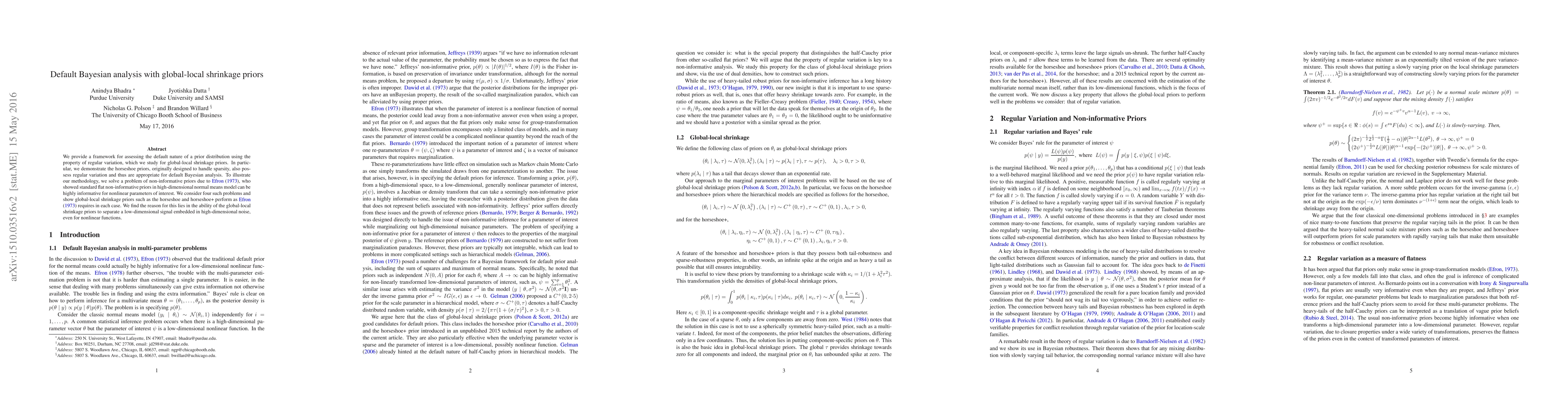 This paper introduces a framework for default Bayesian analysis using global-local shrinkage priors, specifically the horseshoe priors, which demonstrate regular variation. It resolves the issue of non-informative priors in high-dimensional settings by effectively separating low-dimensional signals from high-dimensional noise, thereby addressing Efron's (1973) critique of standard flat priors.