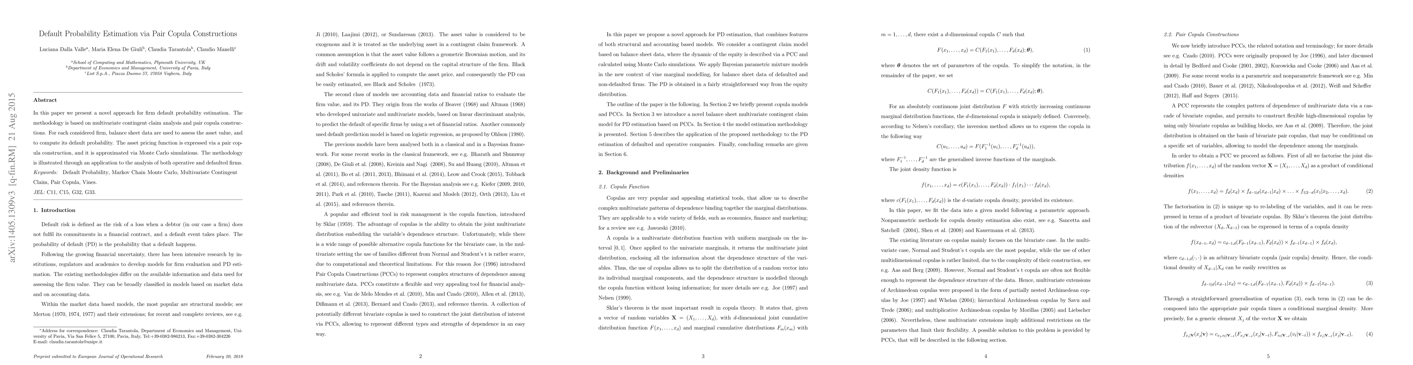 This paper introduces a novel method for estimating firm default probability using multivariate contingent claim analysis and pair copula constructions, employing balance sheet data to assess asset value and Monte Carlo simulations for approximation. The approach is demonstrated through an analysis of both operative and defaulted firms.