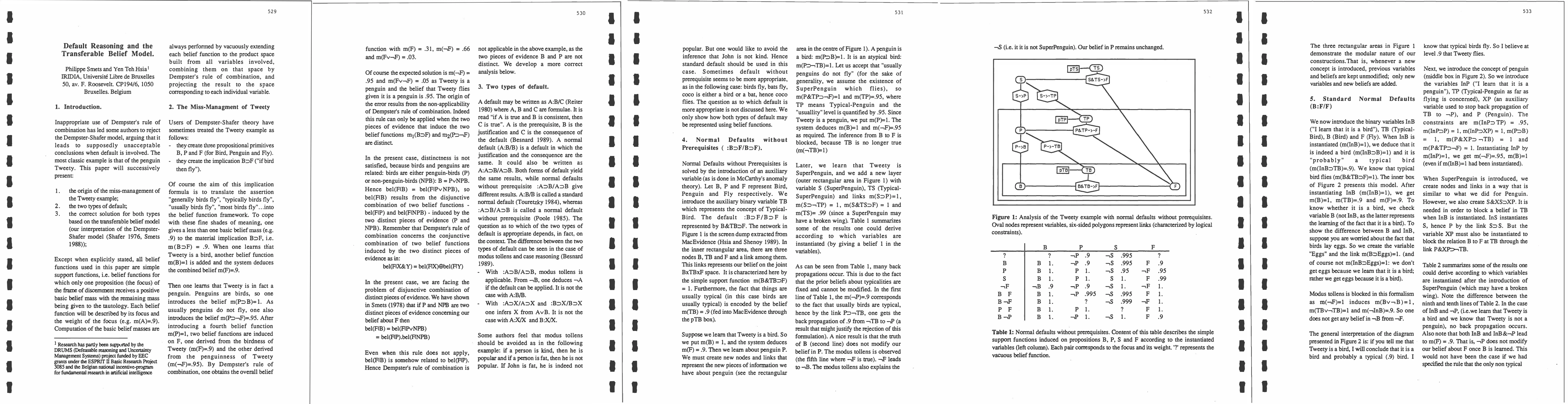 Inappropriate use of Dempster's rule of combination has led some authors to reject the Dempster-Shafer model, arguing that it leads to supposedly unacceptable conclusions when defaults are involved. A most classic example is about the penguin Tweety. This paper will successively present: the origin of the miss-management of the Tweety example; two types of default; the correct solution for both types based on the transferable belief model (our interpretation of the Dempster-Shafer model (Shafer 1976, Smets 1988)); Except when explicitly stated, all belief functions used in this paper are simple support functions, i.e. belief functions for which only one proposition (the focus) of the frame of discernment receives a positive basic belief mass with the remaining mass being given to the tautology. Each belief function will be described by its focus and the weight of the focus (e.g. m(A)=.9). Computation of the basic belief masses are always performed by vacuously extending each belief function to the product space built from all variables involved, combining them on that space by Dempster's rule of combination, and projecting the result to the space corresponding to each individual variable.