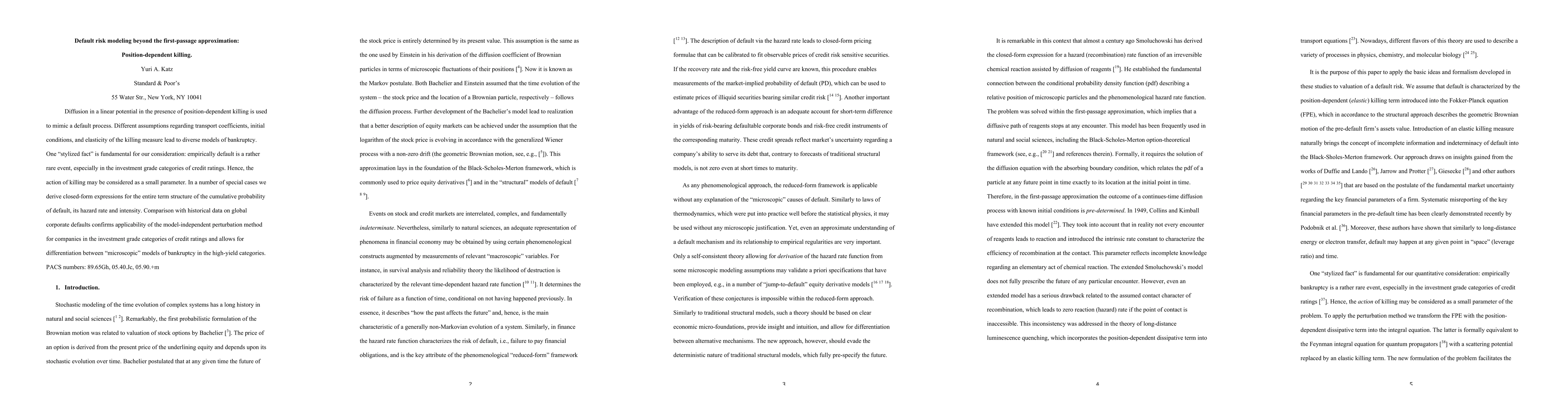 Diffusion in a linear potential in the presence of position-dependent killing is used to mimic a default process. Different assumptions regarding transport coefficients, initial conditions, and elasticity of the killing measure lead to diverse models of bankruptcy. One "stylized fact" is fundamental for our consideration: empirically default is a rather rare event, especially in the investment grade categories of credit ratings. Hence, the action of killing may be considered as a small parameter. In a number of special cases we derive closed-form expressions for the entire term structure of the cumulative probability of default, its hazard rate and intensity. Comparison with historical data on global corporate defaults confirms applicability of the model-independent perturbation method for companies in the investment grade categories of credit ratings and allows for
