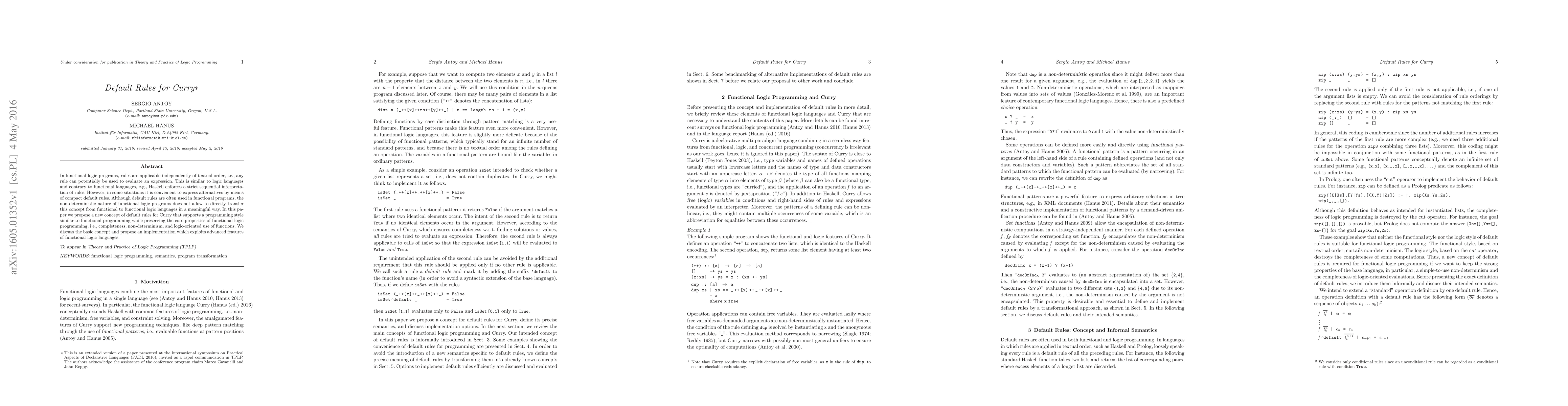 This paper proposes a new concept of default rules for Curry functional logic programming that allows for a programming style akin to functional programming while maintaining the completeness, non-determinism, and logic-oriented use of functions inherent in functional logic programming. The implementation leverages advanced features of functional logic languages to achieve this.