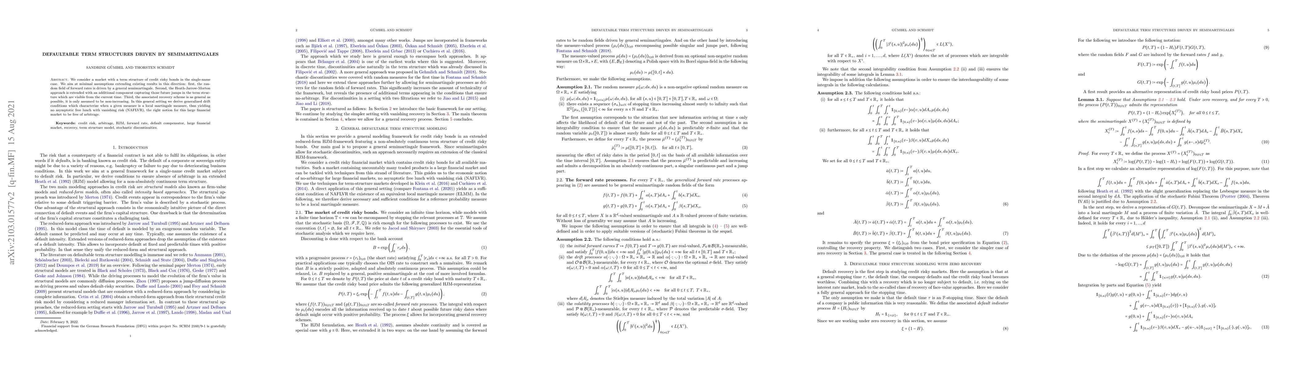 We consider a market with a term structure of credit risky bonds in the single-name case. We aim at minimal assumptions extending existing results in this direction: first, the random field of forward rates is driven by a general semimartingale. Second, the Heath-Jarrow-Morton approach is extended with an additional component capturing those future jumps in the term structure which are visible from the current time. Third, the associated recovery scheme is as general as possible, it is only assumed to be non-increasing. In this general setting we derive generalized drift conditions which characterize when a given measure is a local martingale measure, thus yielding no asymptotic free lunch with vanishing risk (NAFLVR), the right notion for this large financial market to be free of arbitrage.
