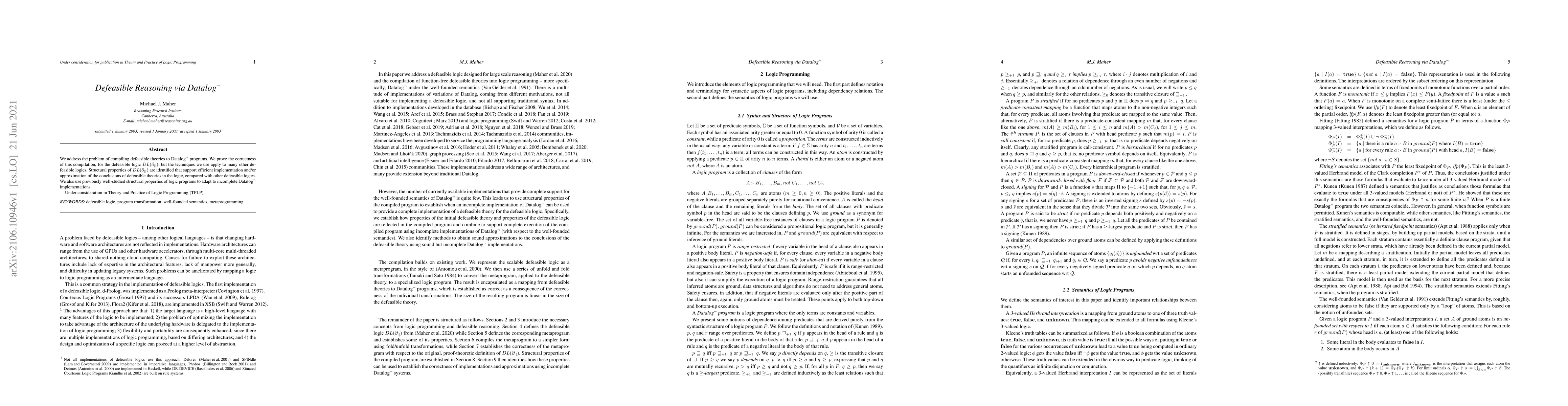 We address the problem of compiling defeasible theories to Datalog$^\neg$ programs. We prove the correctness of this compilation, for the defeasible logic $DL(\partial_{||})$, but the techniques we use apply to many other defeasible logics. Structural properties of $DL(\partial_{||})$ are identified that support efficient implementation and/or approximation of the conclusions of defeasible theories in the logic, compared with other defeasible logics. We also use previously well-studied structural properties of logic programs to adapt to incomplete Datalog$^\neg$ implementations.