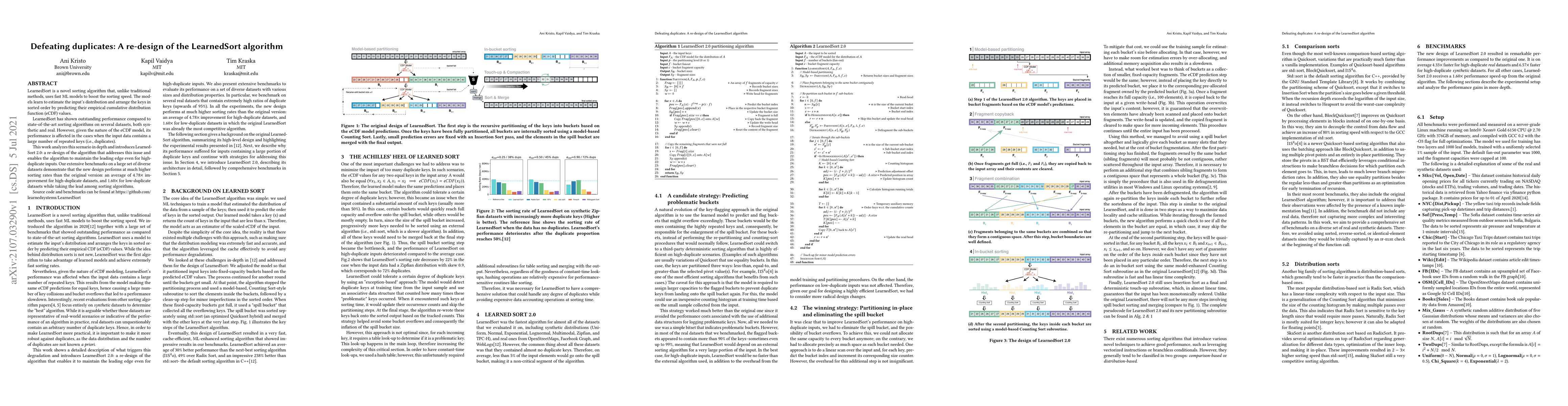 LearnedSort is a novel sorting algorithm that, unlike traditional methods, uses fast ML models to boost the sorting speed. The models learn to estimate the input's distribution and arrange the keys in sorted order by predicting their empirical cumulative distribution function (eCDF) values. LearnedSort has shown outstanding performance compared to state-of-the-art sorting algorithms on several datasets, both synthetic and real. However, given the nature of the eCDF model, its performance is affected in the cases when the input data contains a large number of repeated keys (i.e., duplicates). This work analyzes this scenario in depth and introduces LearnedSort 2.0: a re-design of the algorithm that addresses this issue and enables the algorithm to maintain the leading edge even for high-duplicate inputs. Our extensive benchmarks on a large set of diverse datasets demonstrate that the new design performs at much higher sorting rates than the original version: an average of 4.78x improvement for high-duplicate datasets, and 1.60x for low-duplicate datasets while taking the lead among sorting algorithms.