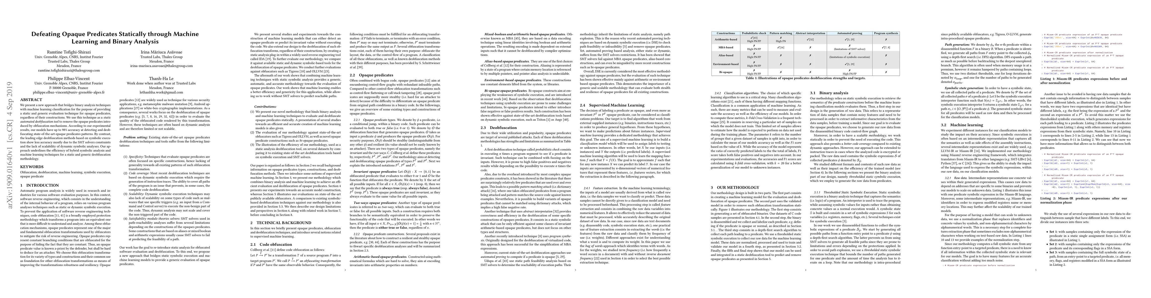 This paper introduces a hybrid method combining binary analysis and machine learning to statically evaluate opaque predicates for deobfuscation, achieving up to 98% accuracy. It outperforms traditional symbolic execution methods by addressing scalability and solver constraints issues.