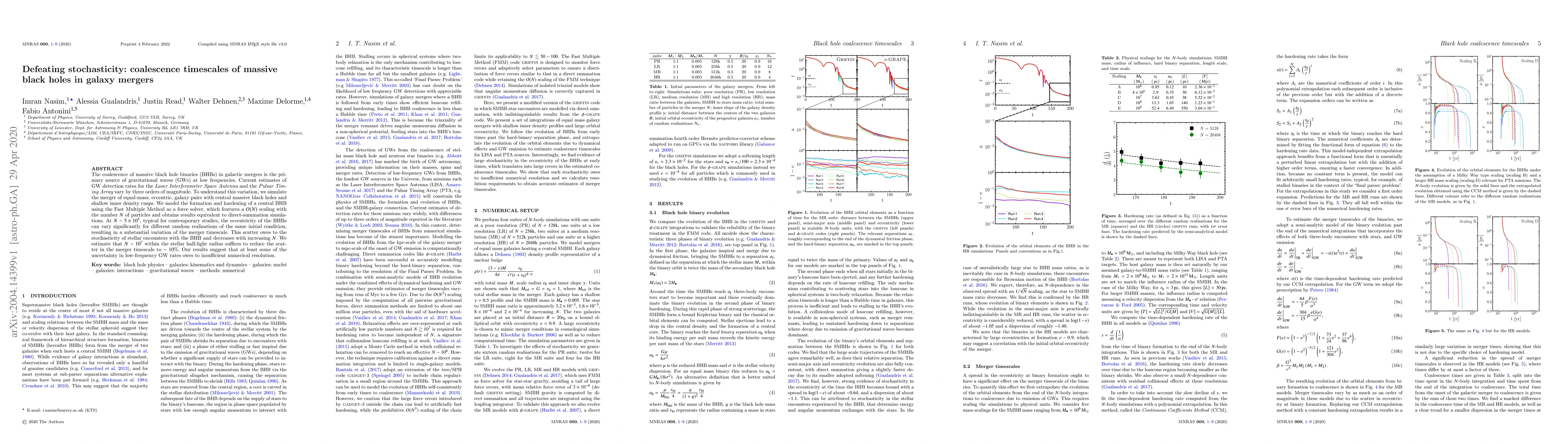 The coalescence of massive black hole binaries (BHBs) in galactic mergers is the primary source of gravitational waves (GWs) at low frequencies. Current estimates of GW detection rates for the Laser Interferometer Space Antenna and the Pulsar Timing Array vary by three orders of magnitude. To understand this variation, we simulate the merger of equal-mass, eccentric, galaxy pairs with central massive black holes and shallow inner density cusps. We model the formation and hardening of a central BHB using the Fast Multiple Method as a force solver, which features a $O(N)$ scaling with the number $N$ of particles and obtains results equivalent to direct-summation simulations. At $N \sim 5\times 10^5$, typical for contemporary studies, the eccentricity of the BHBs can vary significantly for different random realisations of the same initial condition, resulting in a substantial variation of the merger timescale. This scatter owes to the stochasticity of stellar encounters with the BHB and decreases with increasing $N$. We estimate that $N \sim 10^7$ within the stellar half-light radius suffices to reduce the scatter in the merger timescale to $\sim 10$\%. Our results suggest that at least some of the uncertainty in low-frequency GW rates owes to insufficient numerical resolution.