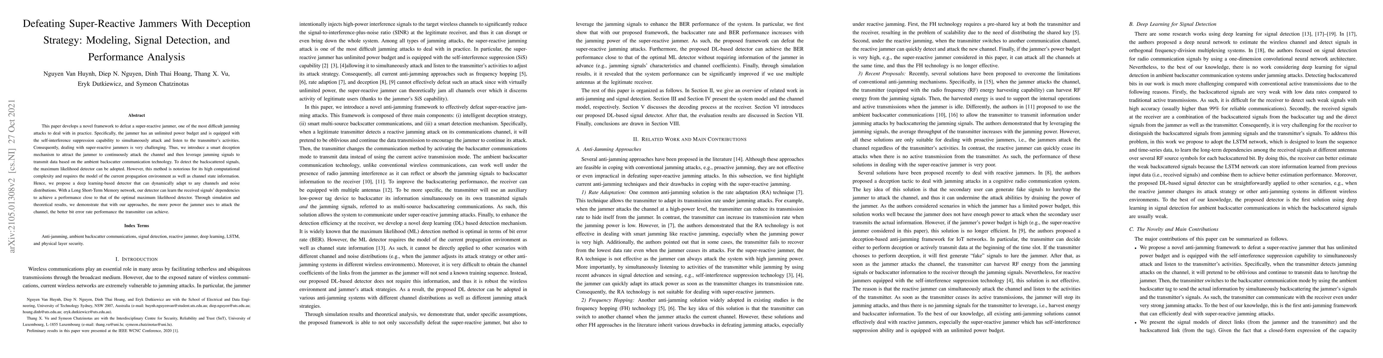 The paper introduces a deception strategy combined with a deep learning-based signal detection method for ambient backscatter communication systems under super-reactive jamming attacks.