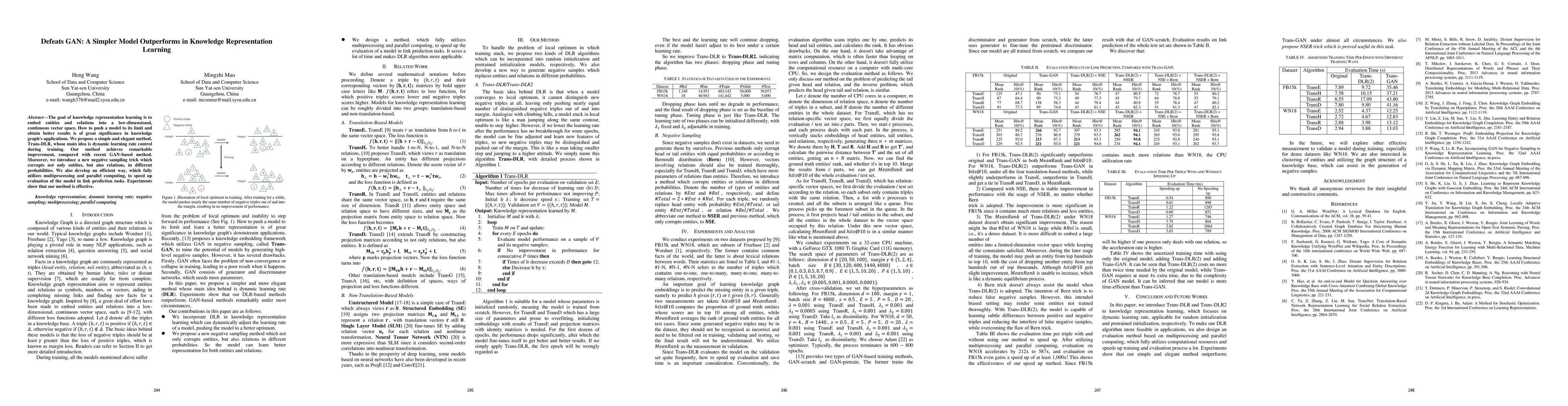 The paper proposes Trans-DLR, a simple method for knowledge representation learning that uses dynamic learning rate control and a novel negative sampling trick to outperform GAN-based models. The method also leverages multiprocessing for faster link prediction evaluations.