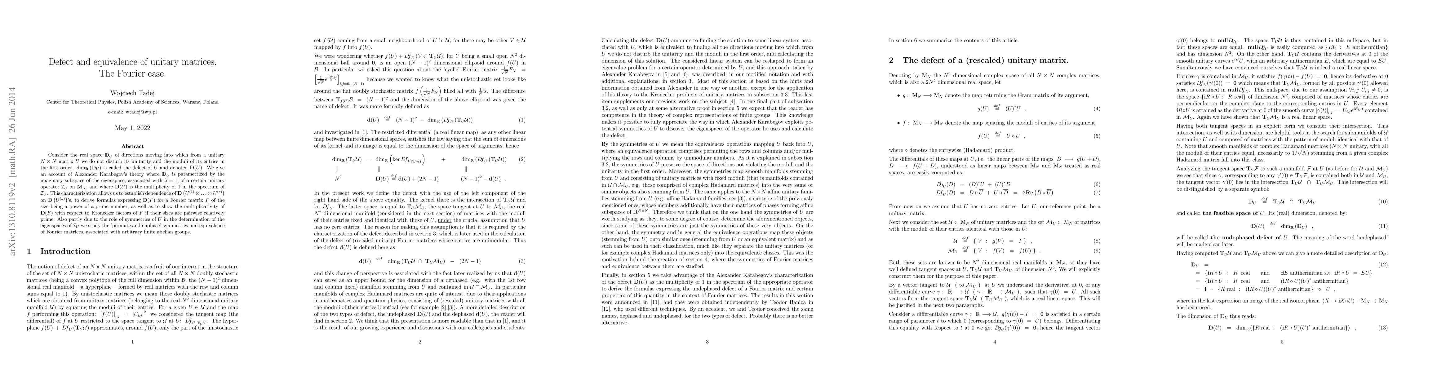Consider the real space D_U of directions moving into which from a unitary N x N matrix U we do not disturb its unitarity and the moduli of its entries in the first order. dim( D_U ) is called the defect of U and denoted D(U). We give an account of Alexander Karabegov's theory where D_U is parametrized by the imaginary subspace of the eigenspace, associated with lambda = 1, of a certain unitary operator I_U on the N x N complex matrices, and where D(U) is the multiplicity of 1 in the spectrum of I_U. This characterization allows us to establish dependence of D(U_1 x ... x U_r) - where x stands for the Kronecker product - on D(U_k)'s, to derive formulas expressing D(F) for a Fourier matrix F of the size being a power of a prime number, as well as to show the multiplicativity of D(F) with respect to Kronecker factors of F if their sizes are pairwise relatively prime. Also partly due to the role of symmetries of U in the determination of the eigenspaces of I_U we study the 'permute and enphase' symmetries and equivalence of Fourier matrices, associated with arbitrary finite abelian groups.