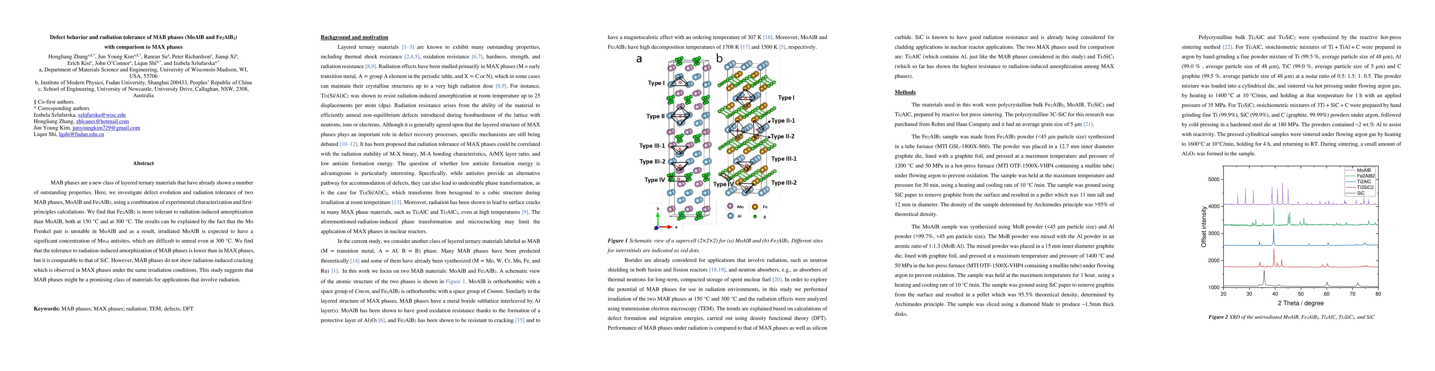 This study investigates the defect behavior and radiation tolerance of MAB phases (MoAlB and Fe2AlB2) compared to MAX phases, finding that Fe2AlB2 is more radiation-tolerant than MoAlB due to the stability of its Frenkel pairs. MAB phases show lower radiation tolerance than MAX phases but comparable to SiC and lack radiation-induced cracking.