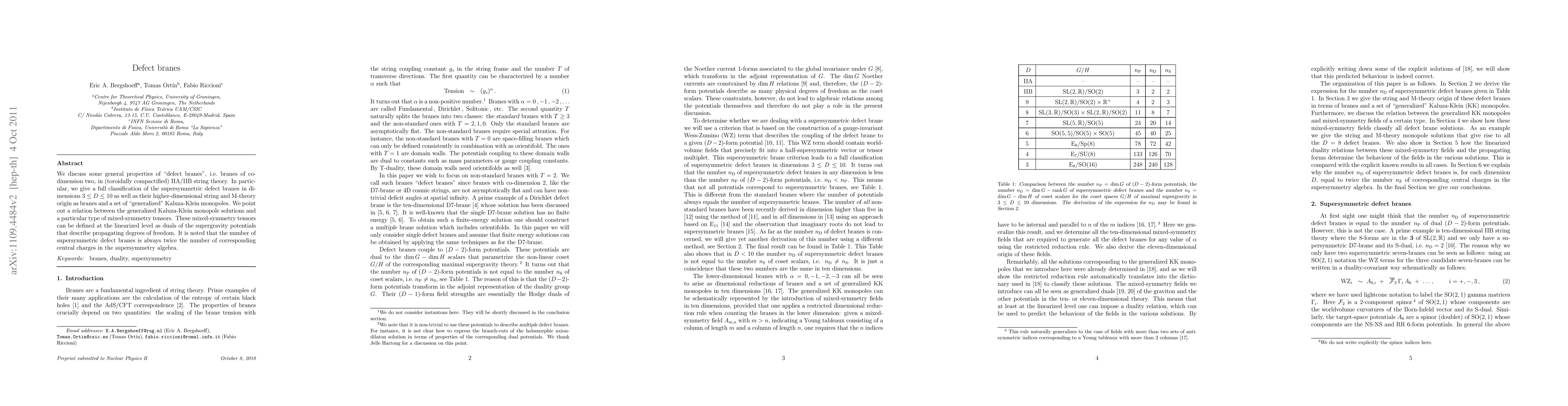 We discuss some general properties of "defect branes", i.e. branes of co-dimension two, in (toroidally compactified) IIA/IIB string theory. In particular, we give a full classification of the supersymmetric defect branes in dimensions 2 < D < 11 as well as their higher-dimensionalstring and M-theory origin as branes and a set of "generalized" Kaluza-Klein monopoles. We point out a relation between the generalized Kaluza-Klein monopole solutions and a particular type of mixed-symmetry tensors. These mixed-symmetry tensors can be defined at the linearized level as duals of the supergravity potentials that describe propagating degrees of freedom. It is noted that the number of supersymmetric defect branes is always twice the number of corresponding central charges in the supersymmetry algebra.