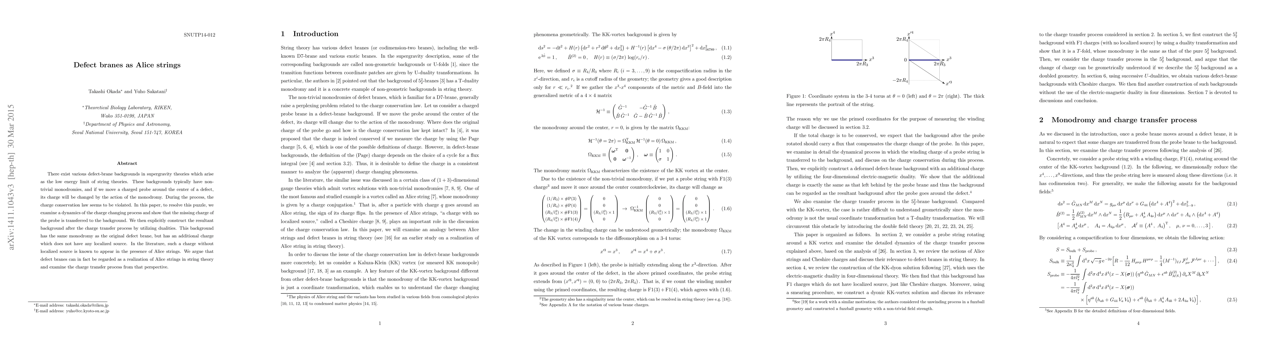 Researchers show that defect branes in string theory can be equivalent to Alice strings, resolving a puzzle involving charge conservation laws when moving probes around defects. They propose a new background with an additional, unlocalized charge, shedding light on the nature of defect branes.