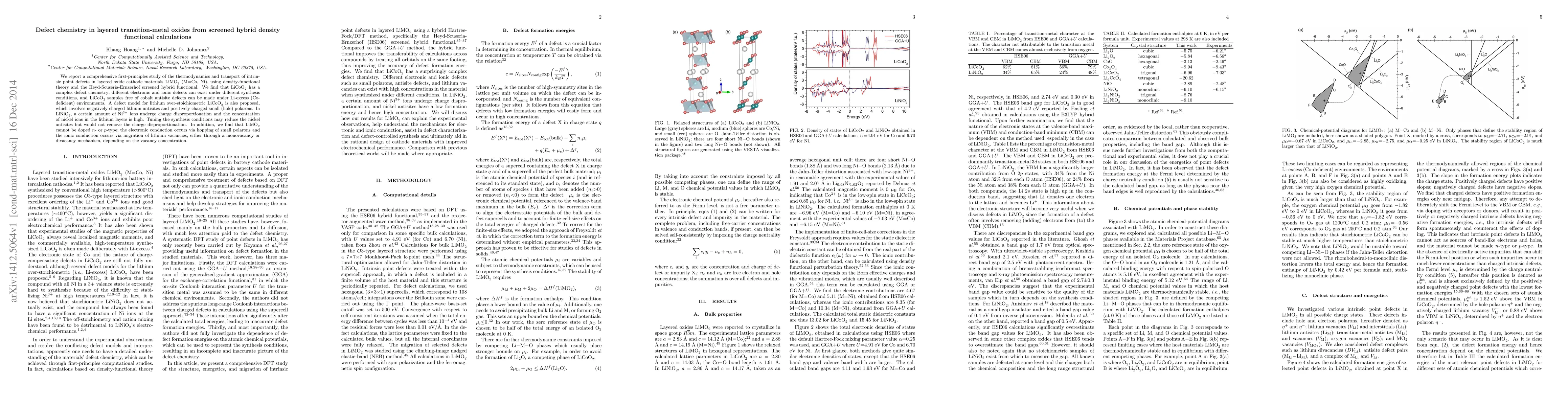 This study uses screened hybrid density functional theory to investigate intrinsic point defects in LiMO$_2$ (M=Co, Ni) layered oxides, revealing complex defect chemistry in LiCoO$_2$ and charge disproportionation in LiNiO$_2$. The electronic and ionic transport mechanisms are identified as small polaron hopping and lithium vacancy migration, respectively.