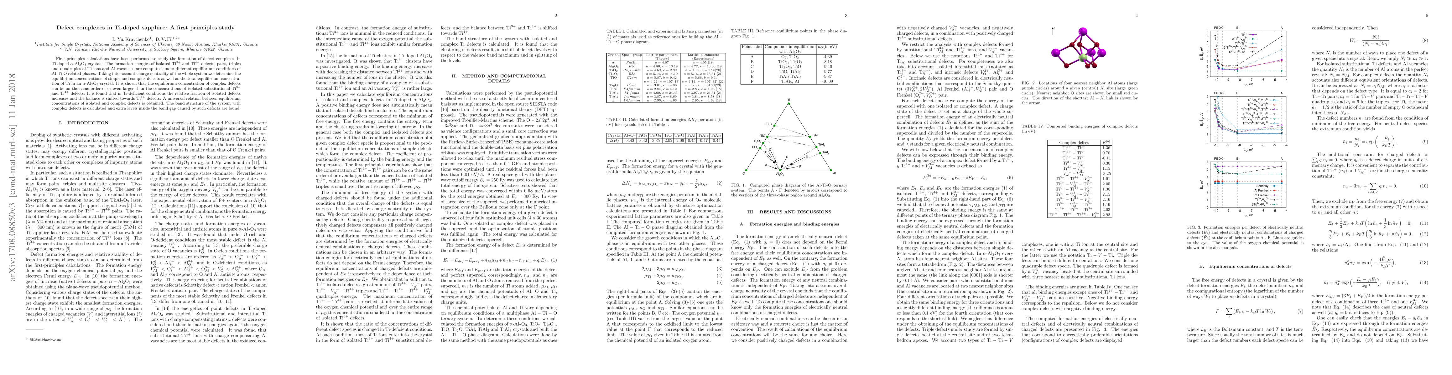 This study uses first-principles calculations to analyze defect complexes in Ti-doped sapphire, finding that complex defects can be as prevalent as isolated Ti3+ and Ti4+ defects. Under Ti-deficient conditions, the concentration of Ti4+ defects increases, and a universal relation between isolated and complex defect concentrations is established.
