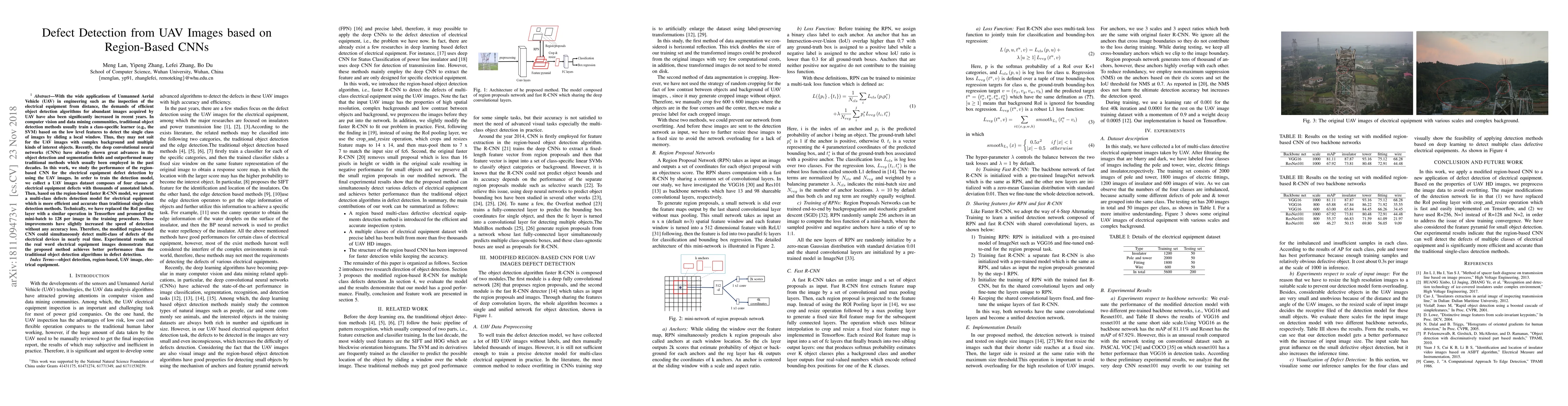 With the wide applications of Unmanned Aerial Vehicle (UAV) in engineering such as the inspection of the electrical equipment from distance, the demands of efficient object detection algorithms for abundant images acquired by UAV have also been significantly increased in recent years. In this work, we study the performance of the region-based CNN for the electrical equipment defect detection by using the UAV images. In order to train the detection model, we collect a UAV images dataset composes of four classes of electrical equipment defects with thousands of annotated labels. Then, based on the region-based faster R-CNN model, we present a multi-class defects detection model for electrical equipment which is more efficient and accurate than traditional single class detection methods. Technically, we have replaced the RoI pooling layer with a similar operation in Tensorflow and promoted the mini-batch to 128 per image in the training procedure. These improvements have slightly increased the speed of detection without any accuracy loss. Therefore, the modified region-based CNN could simultaneously detect multi-class of defects of the electrical devices in nearly real time. Experimental results on the real word electrical equipment images demonstrate that the proposed method achieves better performance than the traditional object detection algorithms in defect detection.