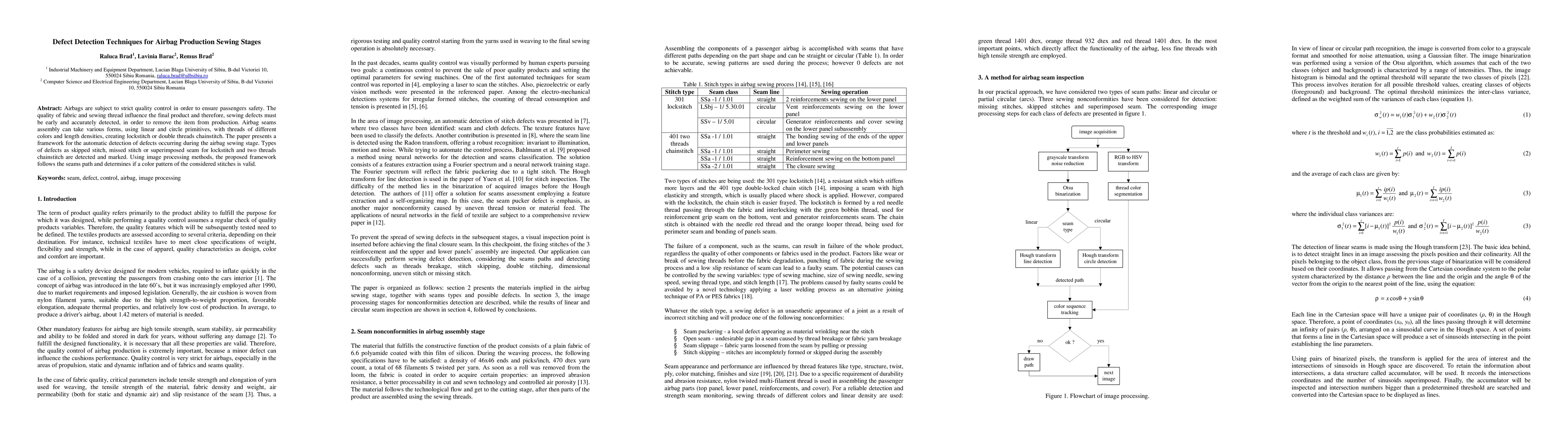 Airbags are subject to strict quality control in order to ensure passengers safety. The quality of fabric and sewing thread influence the final product and therefore, sewing defects must be early and accurately detected, in order to remove the item from production. Airbag seams assembly can take various forms, using linear and circle primitives, with threads of different colors and length densities, creating lockstitch or double threads chainstitch. The paper presents a framework for the automatic detection of defects occurring during the airbag sewing stage. Types of defects as skipped stitch, missed stitch or superimposed seam for lockstitch and two threads chainstitch are detected and marked. Using image processing methods, the proposed framework follows the seams path and determines if a color pattern of the considered stitches is valid.