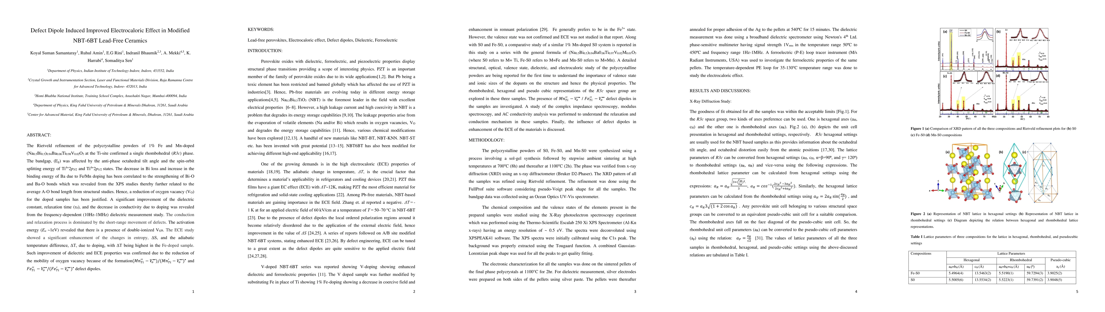 The Rietveld refinement of the polycrystalline powders of 1% Fe and Mn-doped (Na0.5Bi0.5)0.94Ba0.06Ti0.98V0.02O3 at the Ti-site confirmed a single rhombohedral (R3c) phase. The bandgap, (Eg) was affected by the anti-phase octahedral tilt angle and the spin-orbit splitting energy of Ti4+2p3/2 and Ti4+2p1/2 states. The decrease in Bi loss and increase in the binding energy of Ba due to Fe/Mn doping has been correlated to the strengthening of Bi-O and Ba-O bonds which was revealed from the XPS studies thereby further related to the average A-O bond length from structural studies. Hence, a reduction of oxygen vacancy (VO) for the doped samples has been justified. A significant improvement of the dielectric constant, relaxation time ({\tau}0), and the decrease in conductivity due to doping was revealed from the frequency-dependent (10Hz-1MHz) dielectric measurement study. The conduction and relaxation process is dominated by the short-range movement of defects. The activation energy (Ea ~1eV) revealed that there is a presence of double-ionized VOs. The ECE study showed a significant enhancement of the changes in entropy, and the adiabatic temperature difference due to doping, with the change in tempearture being highest in the Fe-doped sample. Such improvement of dielectric and ECE properties was confirmed due to the reduction of the mobility of oxygen vacancy because of the formation defect dipoles.