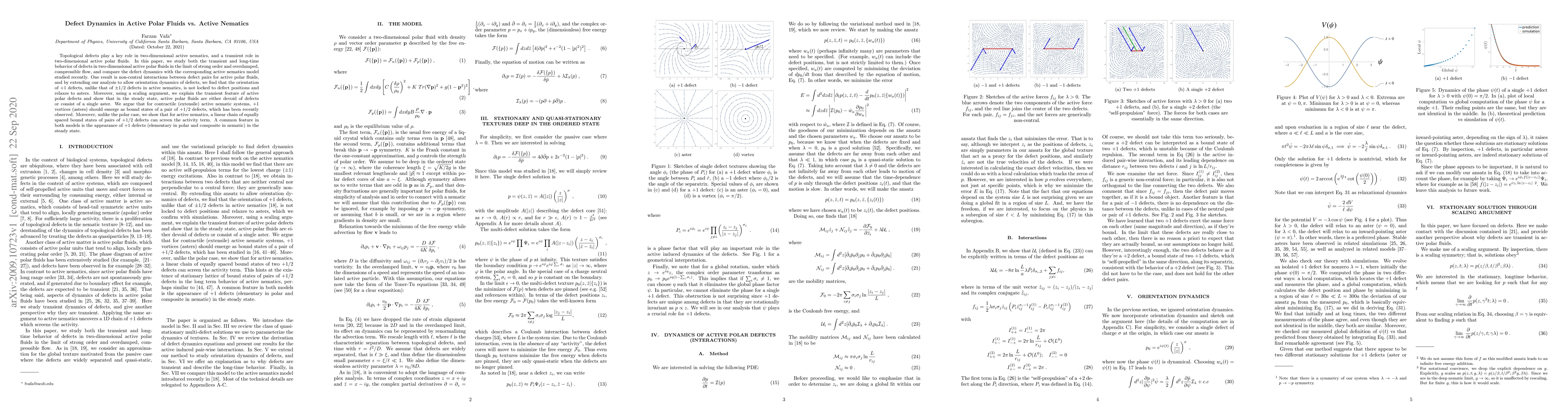 This research investigates defect dynamics in two-dimensional active polar fluids compared to active nematics, finding non-central interactions in polar fluids and revealing that the orientation of $+1$ defects relaxes to asters, unlike in nematics. It concludes that active polar fluids either lack defects or contain a single aster in steady state, while active nematics can form linear chains of $+1/2$ defect pairs.