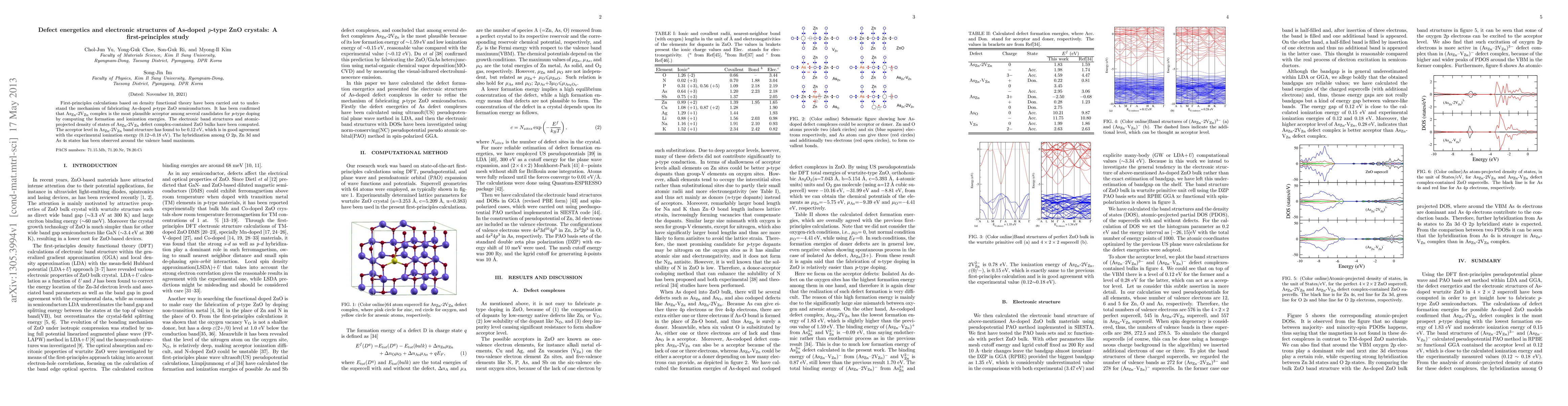 This study uses first-principles calculations to identify AsZn-2VZn as the most plausible acceptor for p-type doping in ZnO, with an acceptor level of 0.12 eV, closely matching experimental ionization energies, and revealing hybridization among O 2p, Zn 3d, and As 4s states near the valence band maximum.