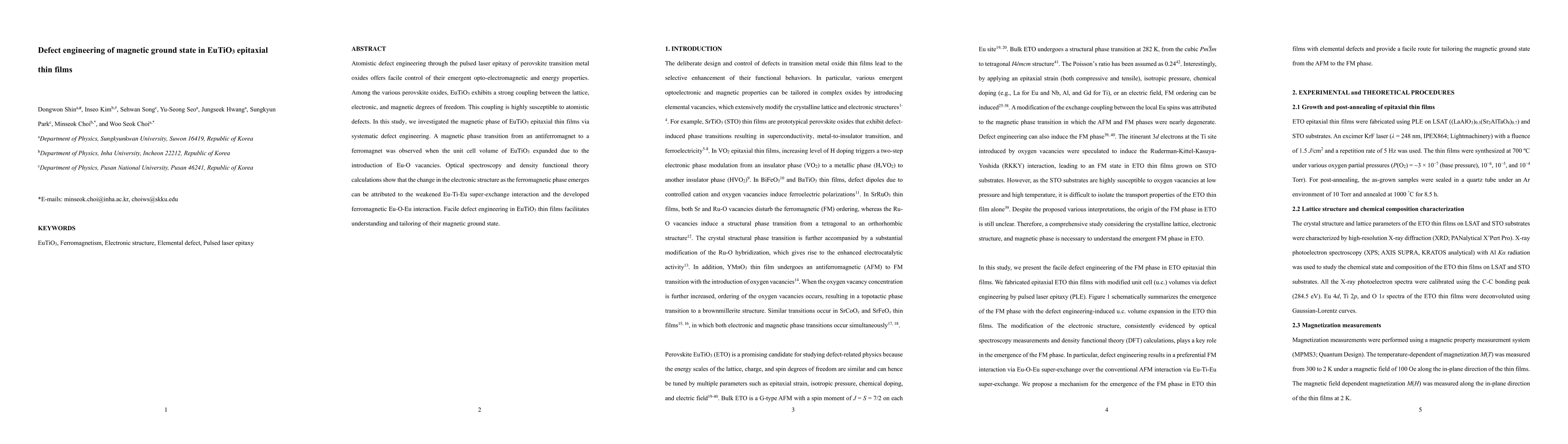 Atomistic defect engineering through the pulsed laser epitaxy of perovskite transition metal oxides offers facile control of their emergent opto-electromagnetic and energy properties. Among the various perovskite oxides, EuTiO3 exhibits a strong coupling between the lattice, electronic, and magnetic degrees of freedom. This coupling is highly susceptible to atomistic defects. In this study, we investigated the magnetic phase of EuTiO$_3$ epitaxial thin films via systematic defect engineering. A magnetic phase transition from an antiferromagnet to a ferromagnet was observed when the unit cell volume of EuTiO3 expanded due to the introduction of Eu-O vacancies. Optical spectroscopy and density functional theory calculations show that the change in the electronic structure as the ferromagnetic phase emerges can be attributed to the weakened Eu-Ti-Eu super-exchange interaction and the developed ferromagnetic Eu-O-Eu interaction. Facile defect engineering in EuTiO$_3$ thin films facilitates understanding and tailoring of their magnetic ground state.