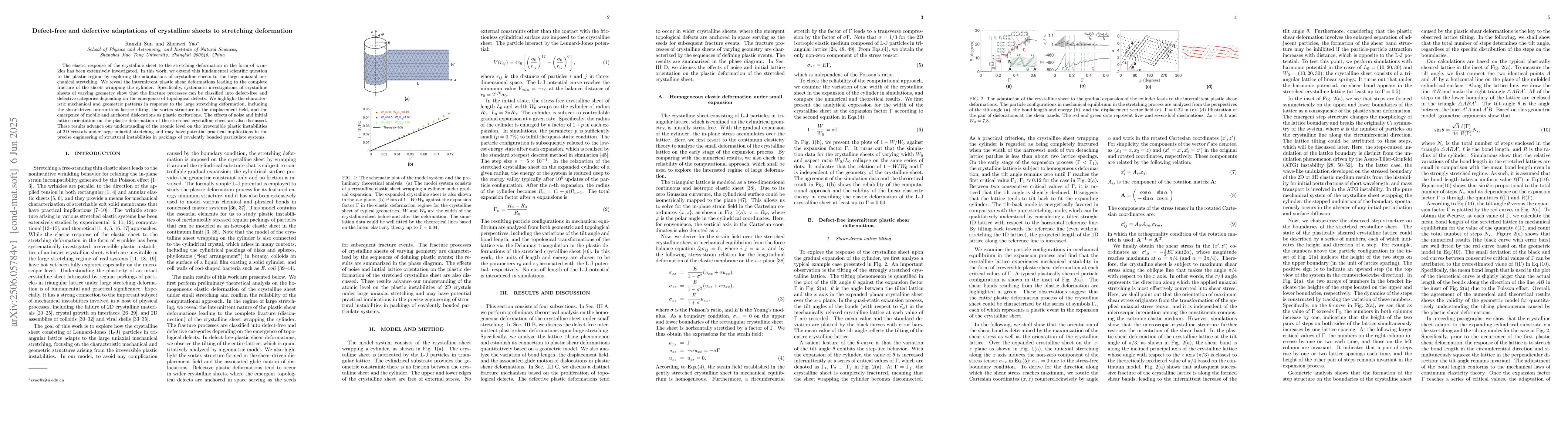 This research investigates how 2D crystalline sheets adapt to large stretching, revealing two types of fracture processes: defect-free and defective. It highlights mechanical and geometric patterns like shear-driven lattice tilting, vortex structures, and dislocation emergence, discussing the impact of noise and initial orientation. The findings enhance understanding of atomic-level plastic instabilities in 2D crystals under stretching, with potential applications in engineering structural instabilities in particle systems.