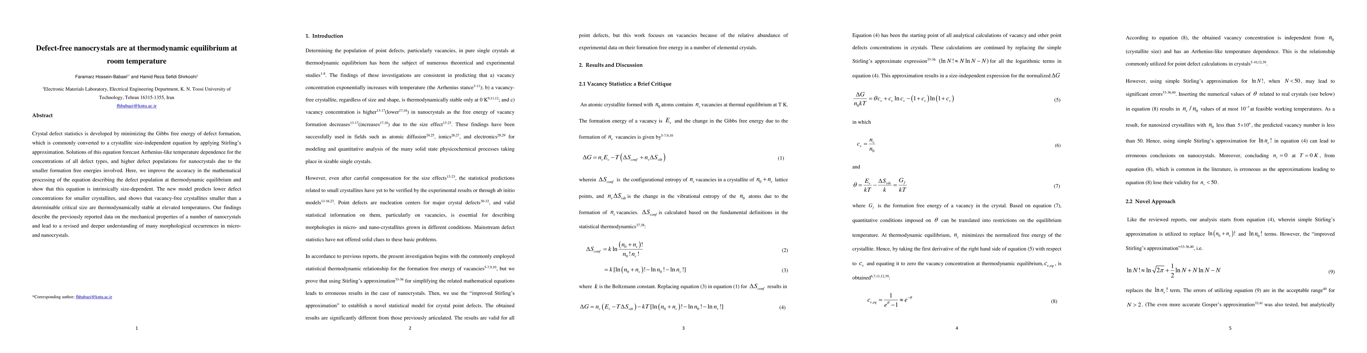 This paper develops a refined model for crystal defect statistics, showing that defect concentrations decrease for smaller nanocrystals, leading to defect-free nanocrystals at thermodynamic equilibrium at room temperature. This new understanding explains the mechanical properties of nanocrystals and provides deeper insights into the morphology of micro- and nanocrystals.