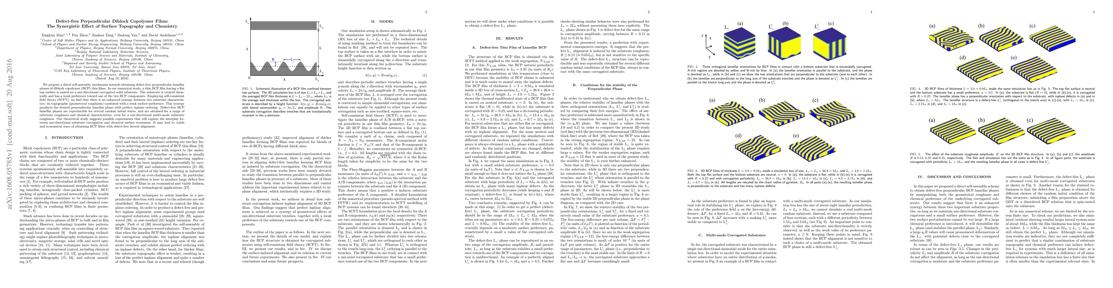 This research proposes a self-assembly method to create defect-free perpendicular lamellar phases in diblock copolymer films by combining substrate topography and chemical treatment. The study shows that a synergistic effect of uni-directional corrugation and weak chemical preference on the substrate leads to perfect in-plane ordering in the copolymer film.