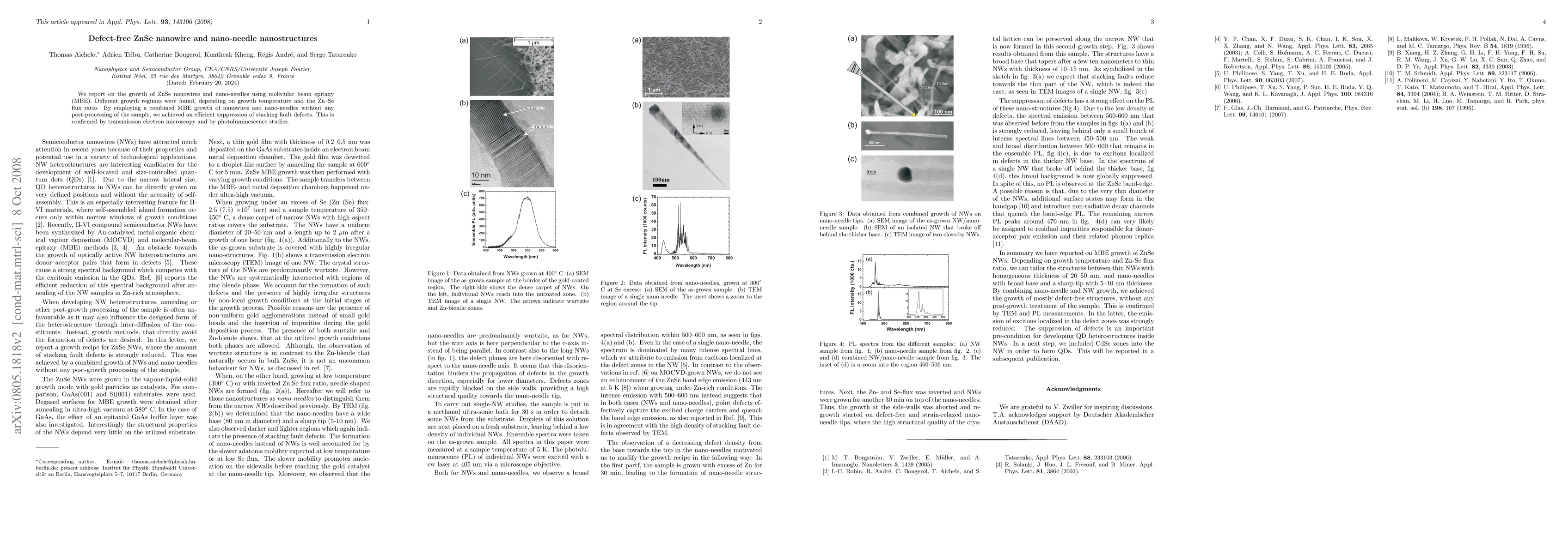 This paper details the growth of defect-free ZnSe nanowires and nano-needles via molecular beam epitaxy, achieving efficient suppression of stacking faults through optimized growth conditions, confirmed by transmission electron microscopy and photoluminescence studies.