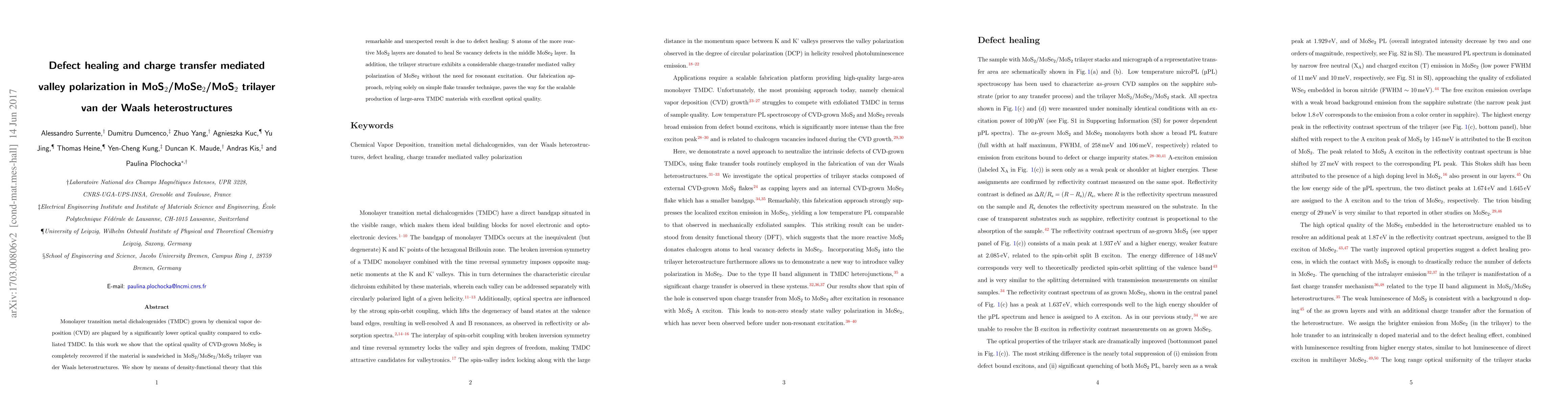 This paper demonstrates that defect healing in CVD-grown MoSe$_2$ occurs when it is incorporated into MoS$_2$/MoSe$_2$/MoS$_2$ van der Waals heterostructures, restoring its optical quality through S atom donation from MoS$_2$. Additionally, the trilayer structure shows significant charge-transfer mediated valley polarization in MoSe$_2$ without resonant excitation.