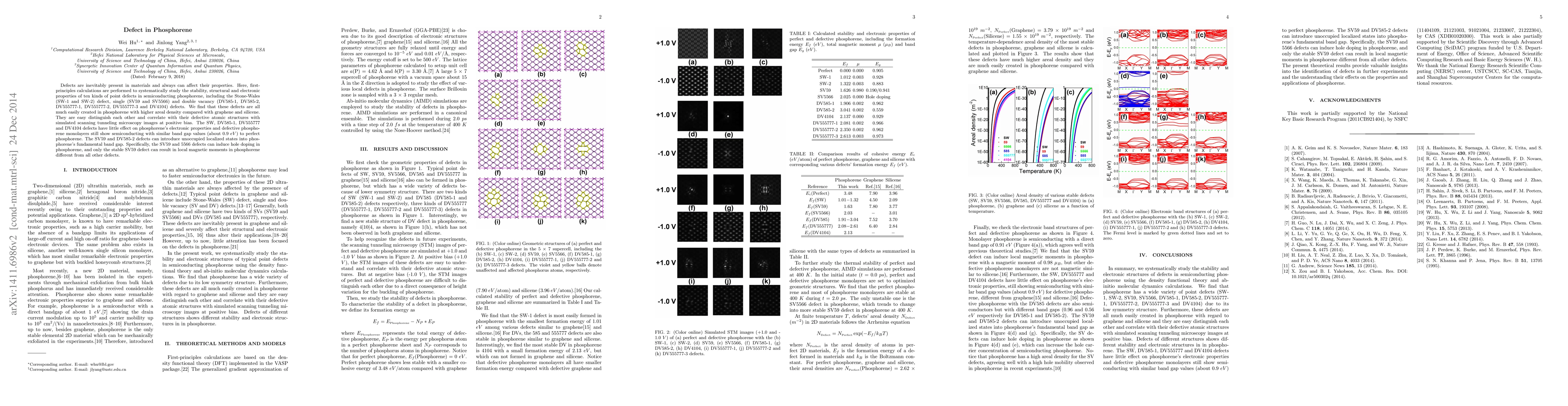 This paper investigates the stability, structural, and electronic properties of various point defects in phosphorene using first-principles calculations. The study finds that phosphorene defects are more easily created than in graphene or silicene and can be distinguished via simulated scanning tunneling microscopy. While most defects maintain phosphorene's semiconducting nature, some, like SV59 and DV585-2, introduce localized states and magnetic moments, affecting its electronic properties.