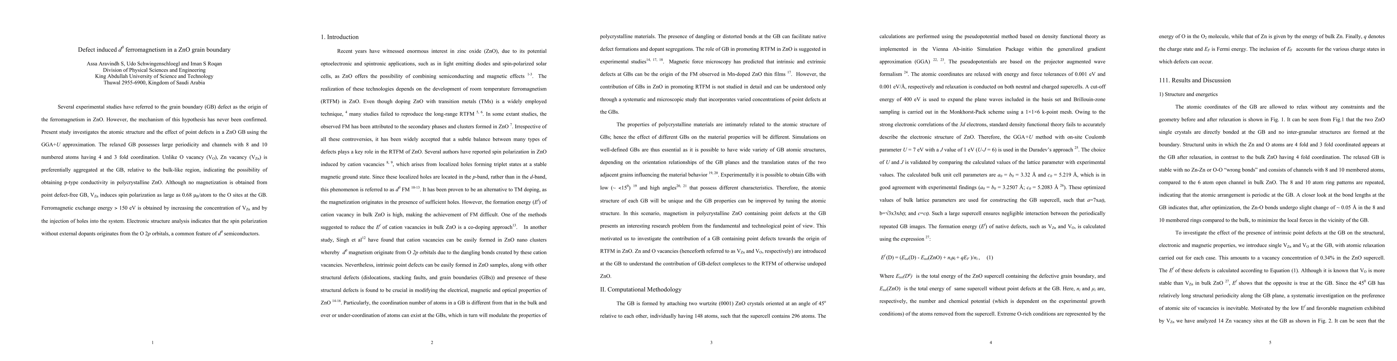 Several experimental studies have referred to the grain boundary (GB) defect as the origin of the ferromagnetism in ZnO. However, the mechanism of this hypothesis has never been confirmed. Present study investigates the atomic structure and the effect of point defects in a ZnO GB using the GGA+U approximation. The relaxed GB possesses large periodicity and channels with 8 and 10 numbered atoms having 4 and 3 fold coordination. Unlike O vacancy (VO), Zn vacancy (VZn) is preferentially aggregated at the GB, relative to the bulk-like region, indicating the possibility of obtaining p-type conductivity in polycrystalline ZnO. Although no magnetization is obtained from point defect-free GB, VZn induces spin polarization as large as 0.68 {\mu}B/atom to the O sites at the GB. Ferromagnetic exchange energy > 150 eV is obtained by increasing the concentration of VZn and by the injection of holes into the system. Electronic structure analysis indicates that the spin polarization without external dopants originates from the O 2p orbitals, a common feature of d0 semiconductors.