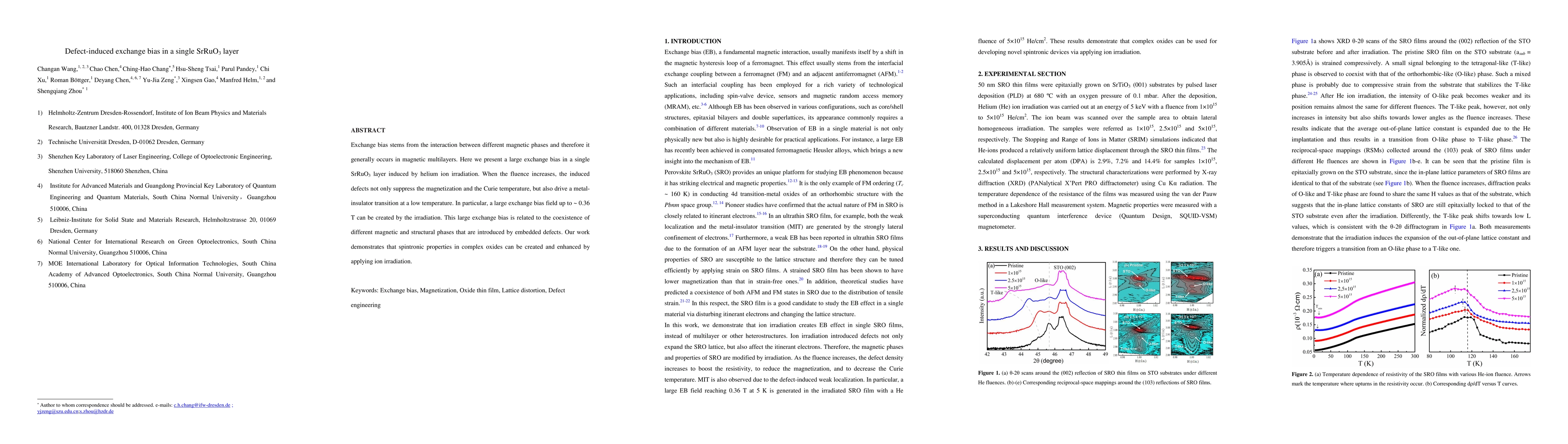 This paper demonstrates that helium ion irradiation can induce a significant exchange bias in a single SrRuO3 layer, driven by defects that suppress magnetization and induce a metal-insulator transition. The study highlights the potential of ion irradiation to enhance spintronic properties in complex oxides.