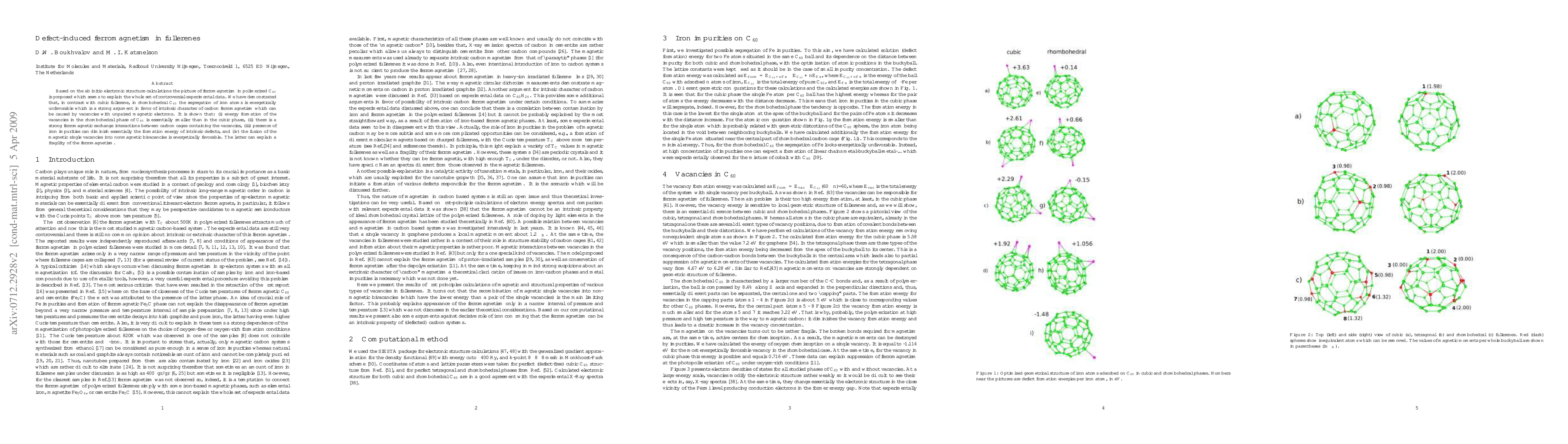 This research paper proposes a new explanation for ferromagnetism in fullerenes, suggesting that defects with unpaired magnetic electrons can cause intrinsic carbon ferromagnetism. The findings reveal stronger exchange interactions between vacancies in rhombohedral C60 than in cubic C60.