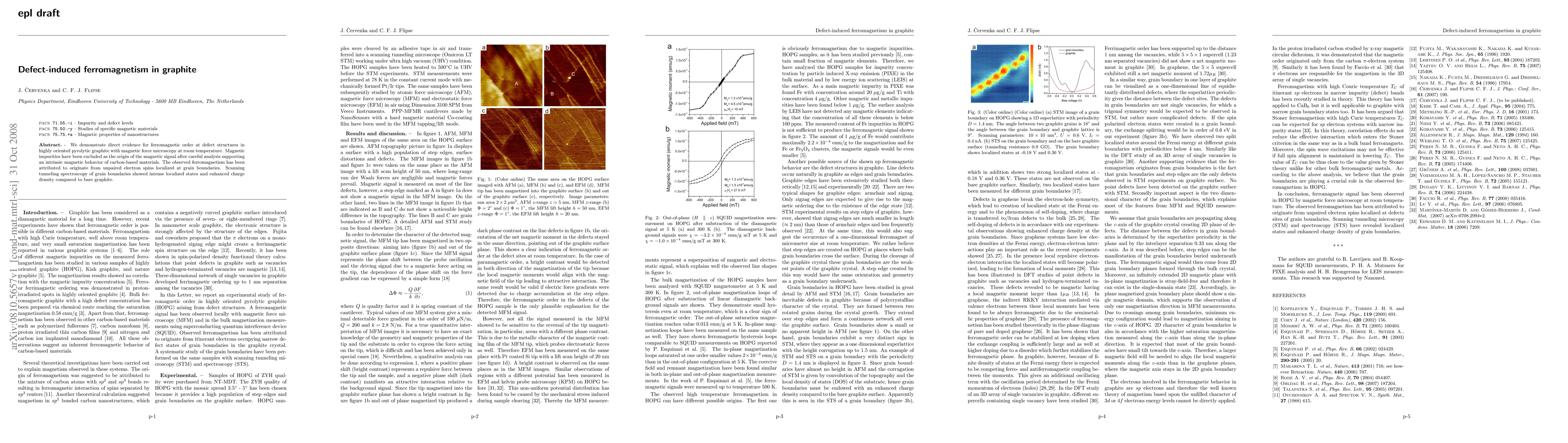 This research provides direct evidence of ferromagnetism in highly oriented pyrolytic graphite at room temperature, induced by defect structures rather than magnetic impurities. The ferromagnetism is attributed to unpaired electron spins localized at grain boundaries, which exhibit intense localized states and enhanced charge density.