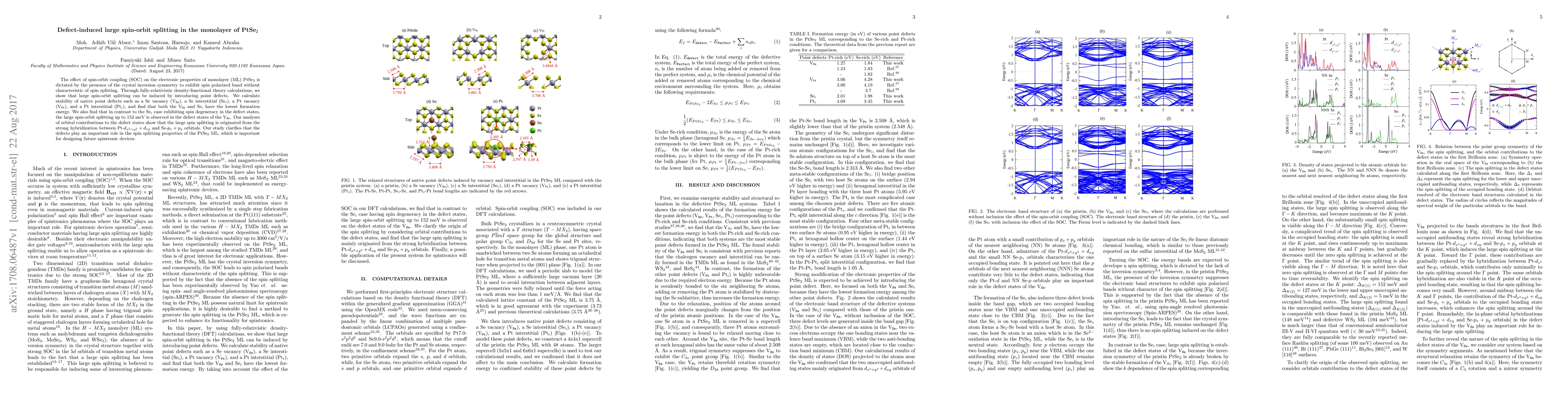 The effect of spin-orbit coupling (SOC) on the electronic properties of monolayer (ML) PtSe$_2$ is dictated by the presence of the crystal inversion symmetry to exhibit spin polarized band without characteristic of spin splitting. Through fully-relativistic density-functional theory calculations, we show that large spin-orbit splitting can be induced by introducing point defects. We calculate stability of native point defects such as a Se vacancy (V$_{\texttt{Se}}$), a Se interstitial (Se$_{i}$), a Pt vacancy (V$_{\texttt{Pt}}$), and a Pt interstitial (Pt$_{i}$), and find that both the V$_{\texttt{Se}}$ and Se$_{i}$ have the lowest formation energy. We also find that in contrast to the Se$_{i}$ case exhibiting spin degeneracy in the defect states, the large spin-orbit splitting up to 152 meV is observed in the defect states of the V$_{\texttt{Se}}$. Our analyses of orbital contributions to the defect states show that the large spin splitting is originated from the strong hybridization between Pt-$d_{x{^2}+y{^2}}+d_{xy}$ and Se-$p_{x}+p_{y}$ orbitals. Our study clarifies that the defects play an important role in the spin splitting properties of the PtSe$_2$ ML, which is important for designing future spintronic devices.