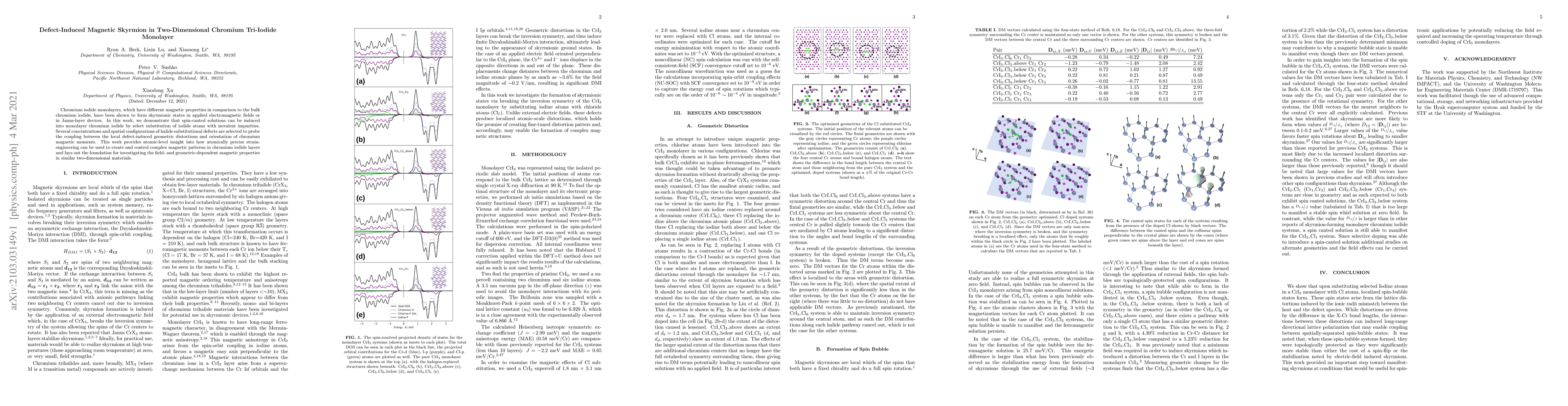 This paper demonstrates that substituting iodide atoms in chromium iodide monolayers with isovalent impurities induces spin-canted magnetic skyrmions. The study provides atomic-level insight into how precise strain-engineering can create and control complex magnetic patterns, laying the groundwork for future research on magnetic properties in two-dimensional materials.