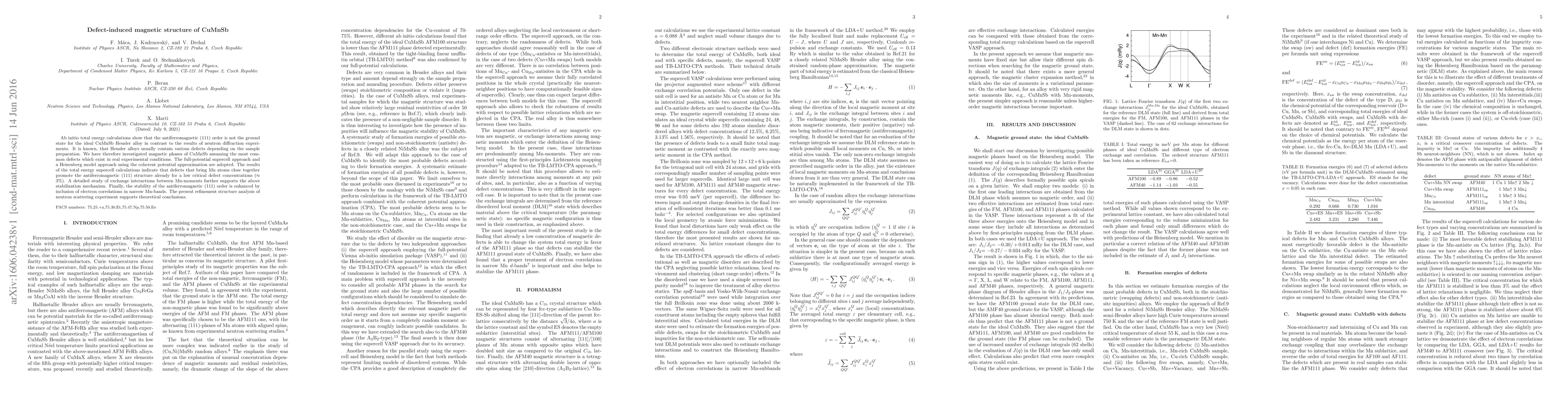 Ab initio total energy calculations show that the antiferromagnetic (111) order is not the ground state for the ideal CuMnSb Heusler alloy in contrast to the results of neutron diffraction experiments. It is known, that Heusler alloys usually contain various defects depending on the sample preparation. We have therefore investigated magnetic phases of CuMnSb assuming the most common defects which exist in real experimental conditions. The full-potential supercell approach and a Heisenberg model approach using the coherent potential approximation are adopted. The results of the total energy supercell calculations indicate that defects that bring Mn atoms close together promote the antiferromagnetic (111) structure already for a low critical defect concentrations ($\approx$ 3%). A detailed study of exchange interactions between Mn-moments further supports the above stabilization mechanism. Finally, the stability of the antiferromagnetic (111) order is enhanced by inclusion of electron correlations in narrow Mn-bands. The present refinement structure analysis of neutron scattering experiment supports theoretical conclusions.