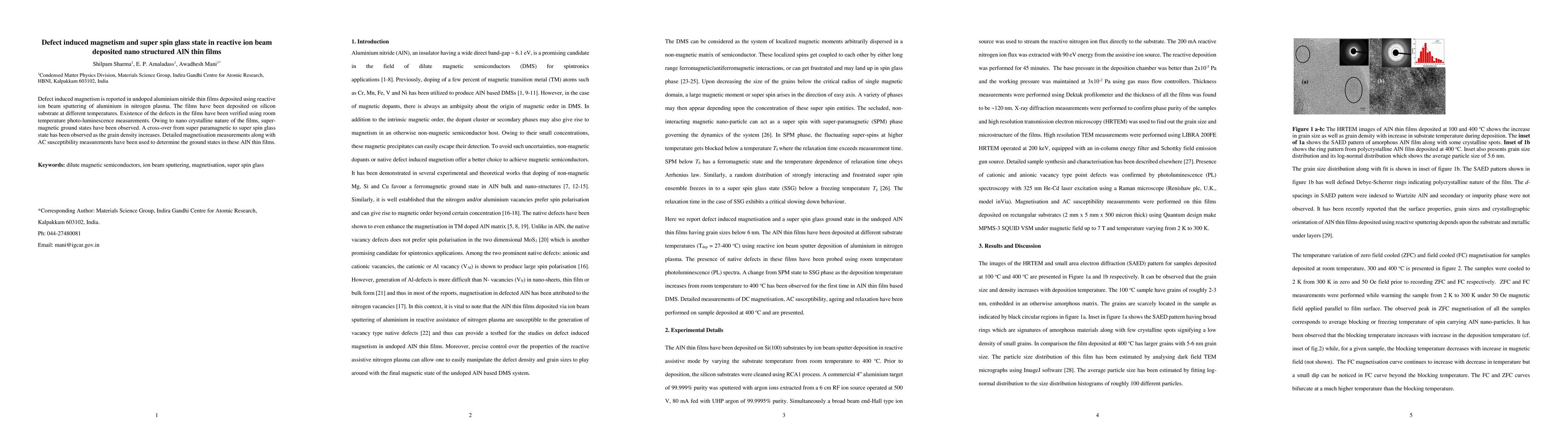 This study reports defect-induced magnetism in undoped AlN thin films deposited via reactive ion beam sputtering, revealing super-magnetic ground states and a transition from super paramagnetic to super spin glass state with increasing grain density, verified by photo-luminescence and magnetisation measurements.