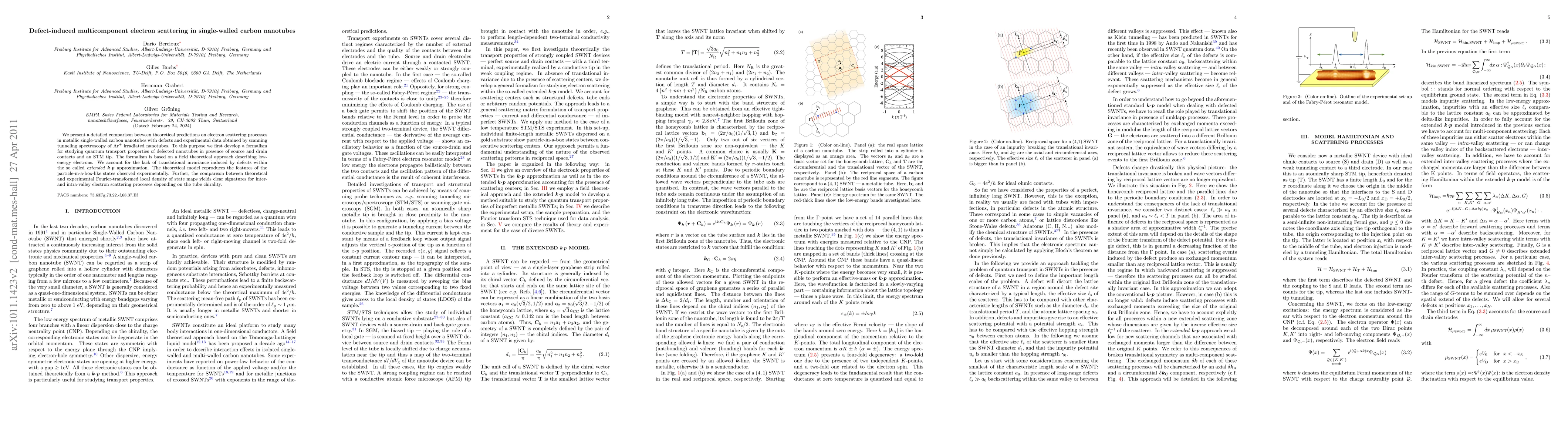 This paper develops a theoretical model to study electron scattering in defective metallic single-walled carbon nanotubes using a field theoretical approach and extended kp approximation. The model accurately reproduces experimental observations from scanning tunneling spectroscopy, revealing signatures of inter- and intra-valley scattering processes.