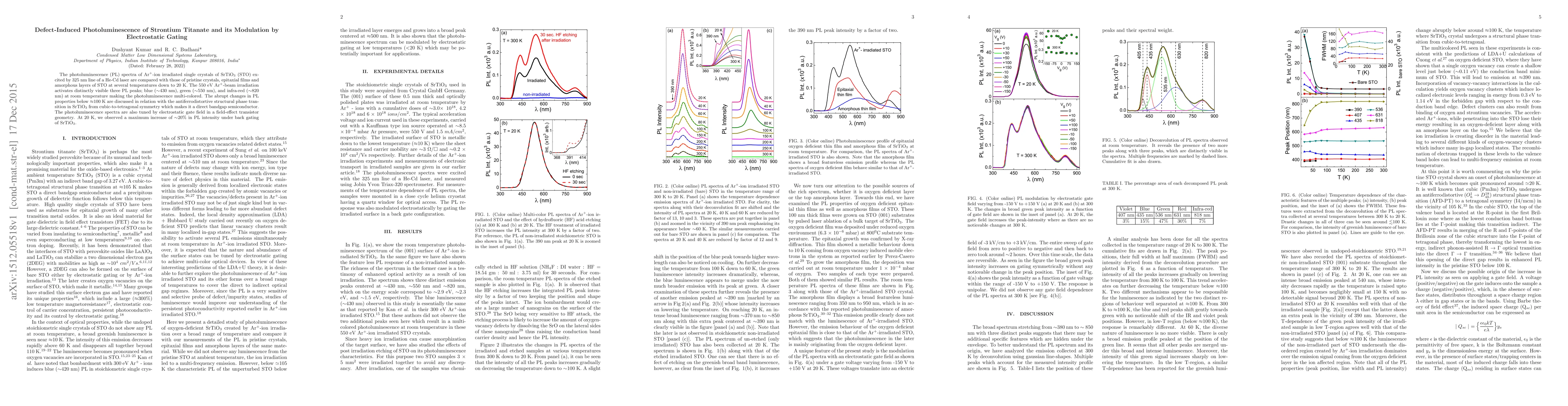 Strontium titanate crystals exhibit multicolored photoluminescence after Ar-ion irradiation, which is modulated by electrostatic gating, increasing PL intensity by up to 20% at 20K.