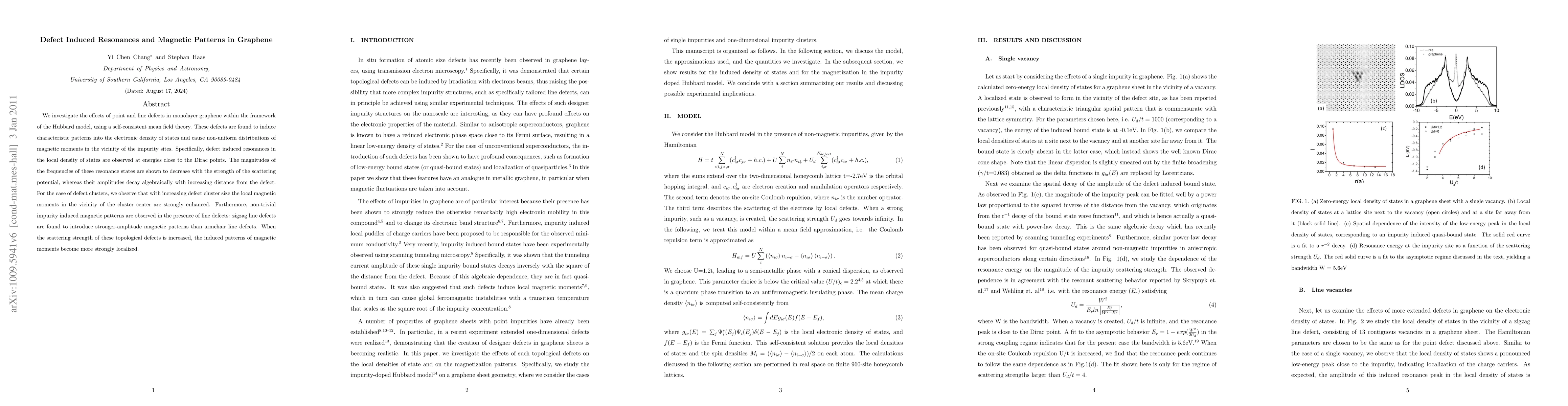 We investigate the effects of point and line defects in monolayer graphene within the framework of the Hubbard model, using a self-consistent mean field theory. These defects are found to induce characteristic patterns into the electronic density of states and cause non-uniform distributions of magnetic moments in the vicinity of the impurity sites. Specifically, defect induced resonance bound states in the local density of states are observed at energies close to the Dirac points. The magnitudes of the frequencies of these resonance states are shown to decrease with the strength of the scattering potential, whereas their amplitudes decay algebraically with increasing distance from the defect. For the case of defect clusters, we observe that with increasing defect cluster size the local magnetic moments in the vicinity of the cluster center are strongly enhanced. Furthermore, non-trivial impurity induced magnetic patterns are observed in the presence of line defects: zigzag line defects are found to introduce stronger-amplitude magnetic patterns than armchair line defects. When the scattering strength of these topological defects is increased, the induced patterns of magnetic moments become more strongly localized.